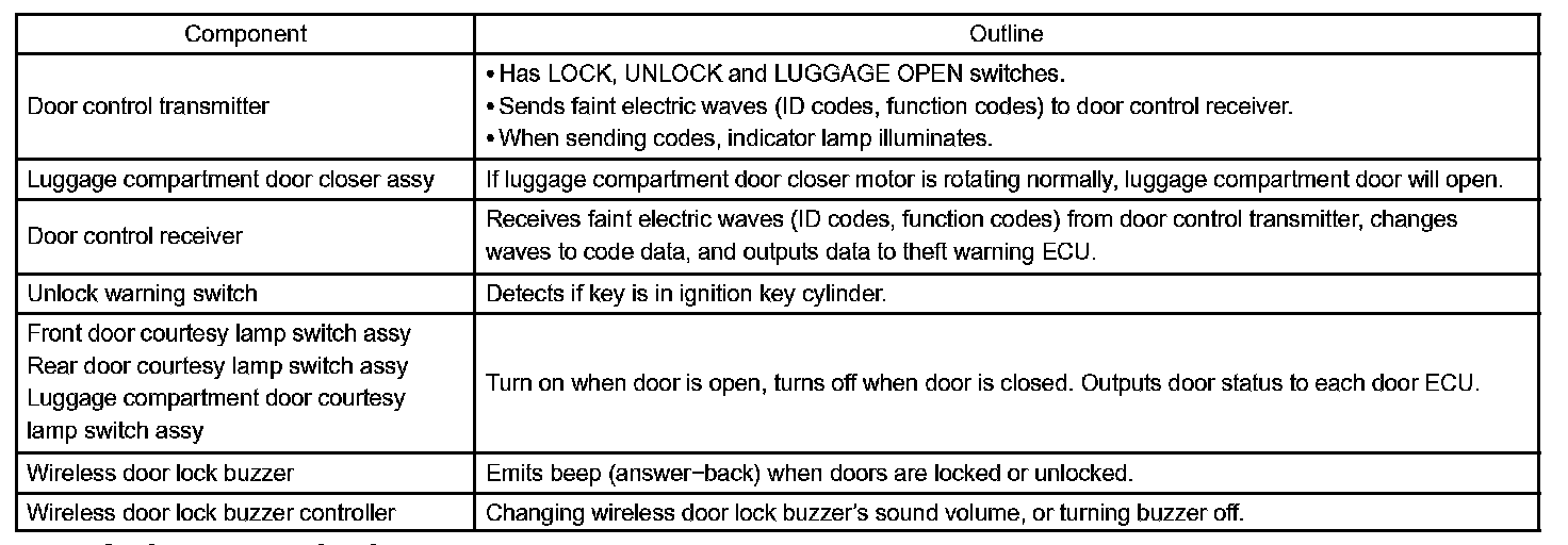 1. In this system, the door lock control receiver performs the code identification process and the theft warning ECU (theft deterrent ECU) operates the door lock control. A serial data link is provided for communication between the door control receiver and the theft warning ECU assembly.