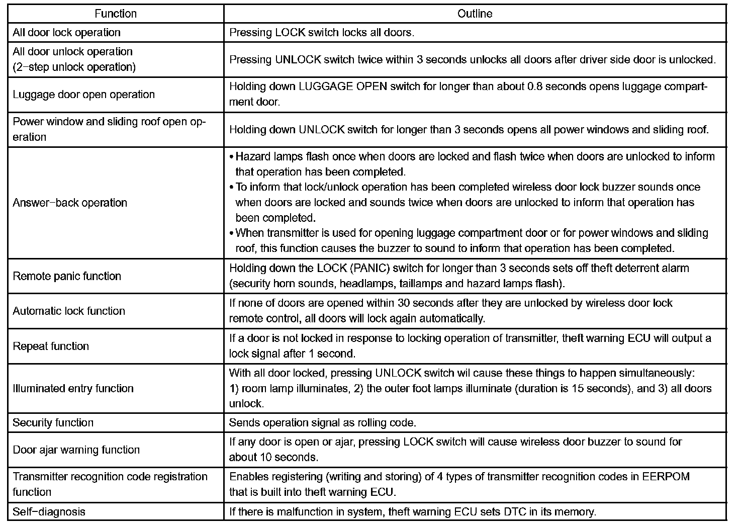2. A key-integrated type transmitter is used and it contains the following 3 switches: the door lock switch, door unlock switch and luggage open switch.