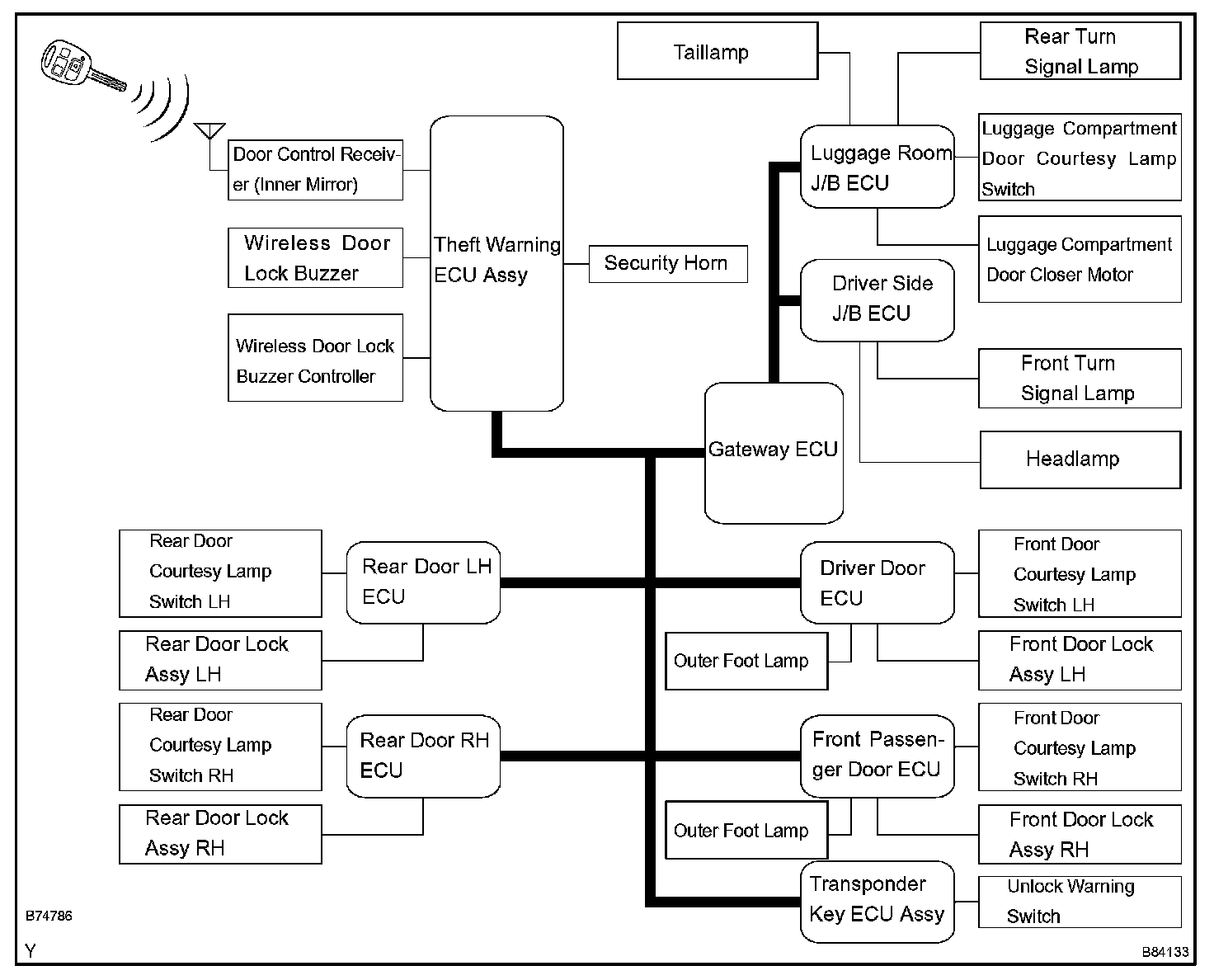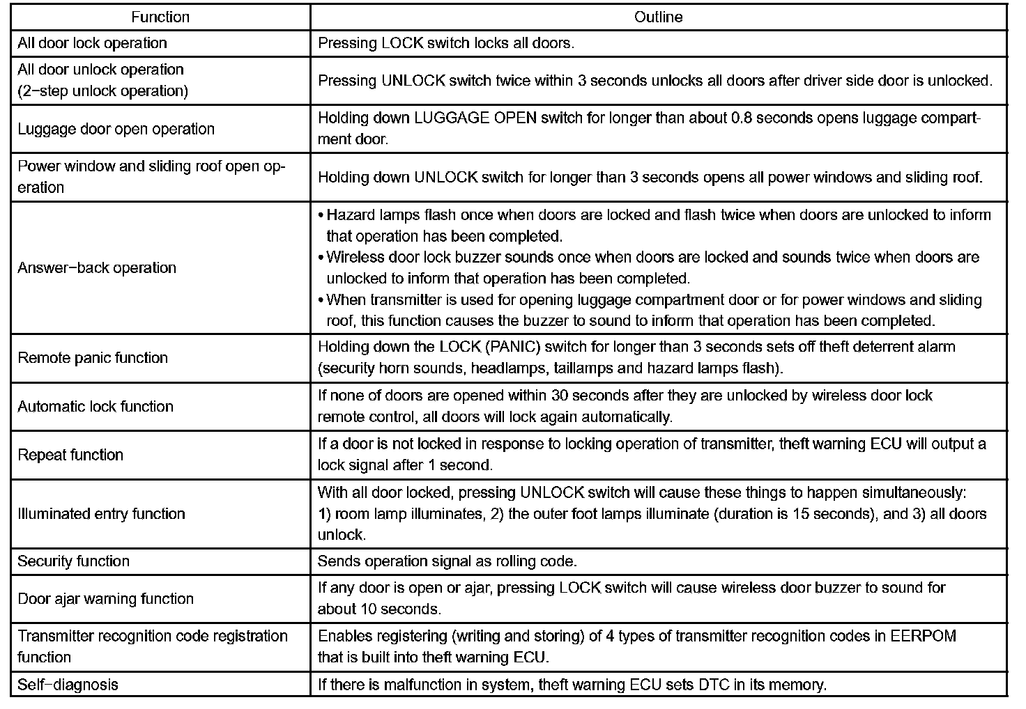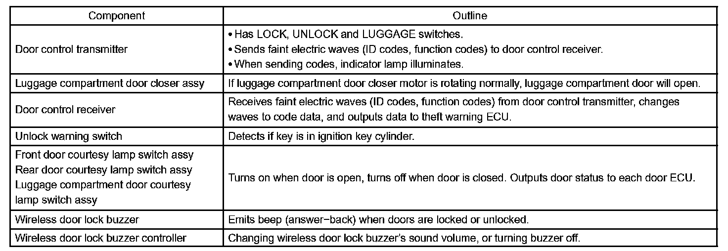 1. In this system, the door lock control receiver performs the code identification process and the theft warning ECU (theft deterrent ECU) operates the door lock control. A serial data link is provided for communication between the door control receiver and the theft warning ECU assembly.