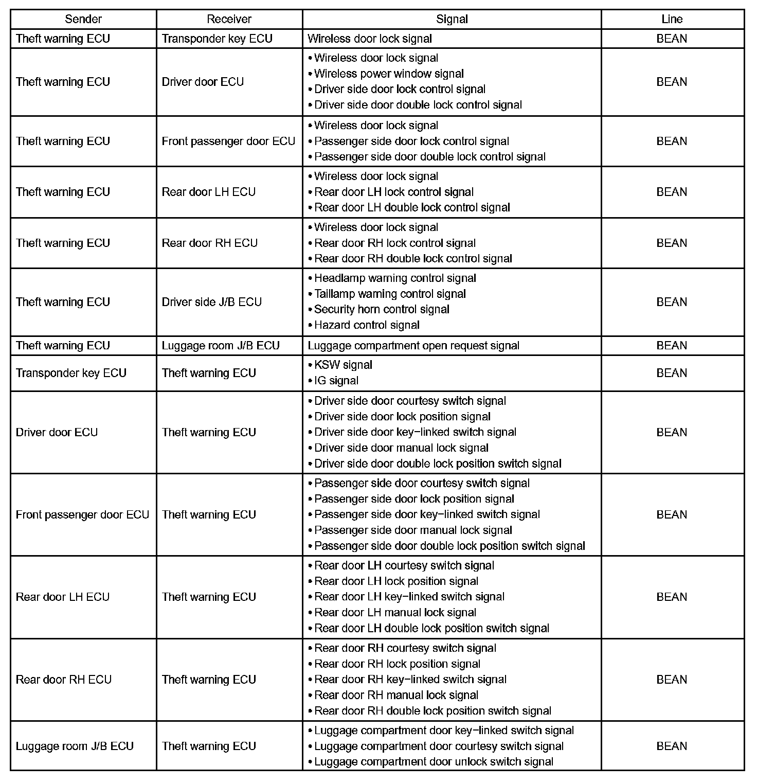 The theft warning ECU receives door control transmitter door LOCK/UNLOCK switch signals through the serial communication line. It sends door LOCK/UNLOCK control signals to each seat's door ECU through the multiplex communication line.