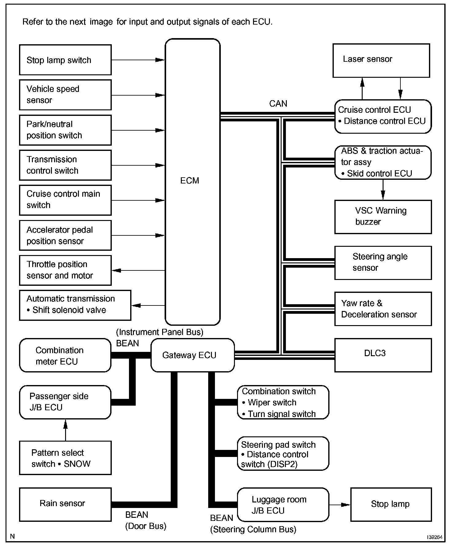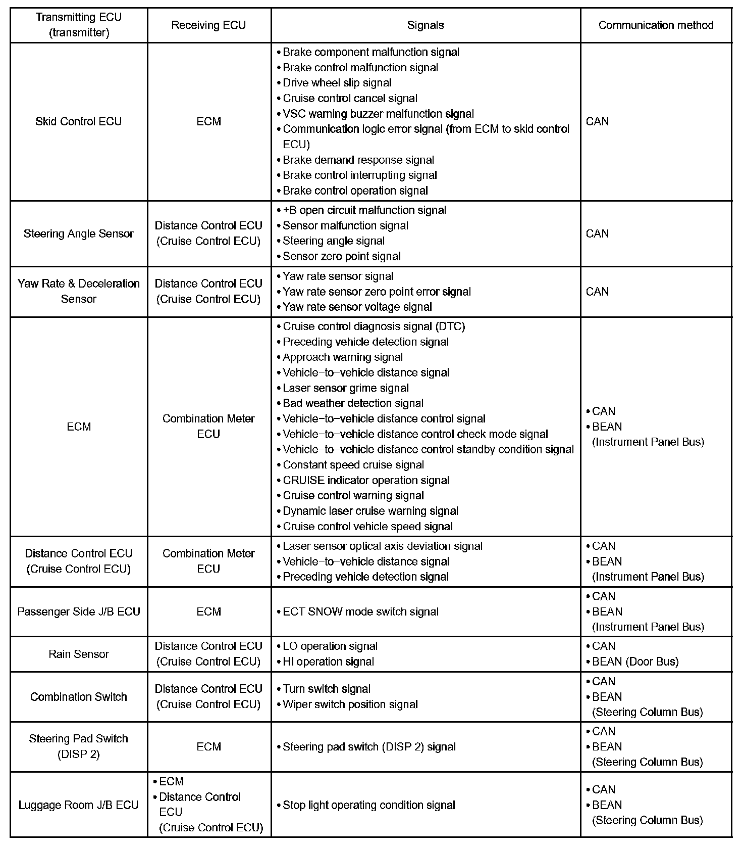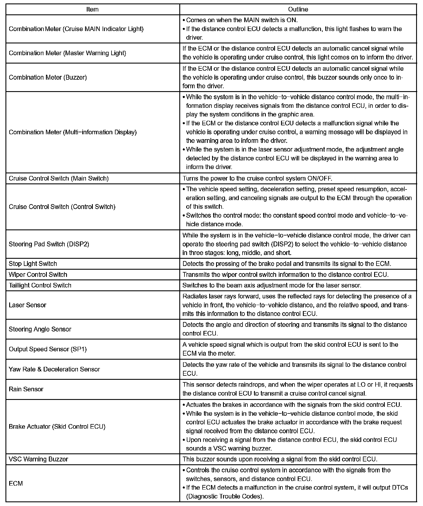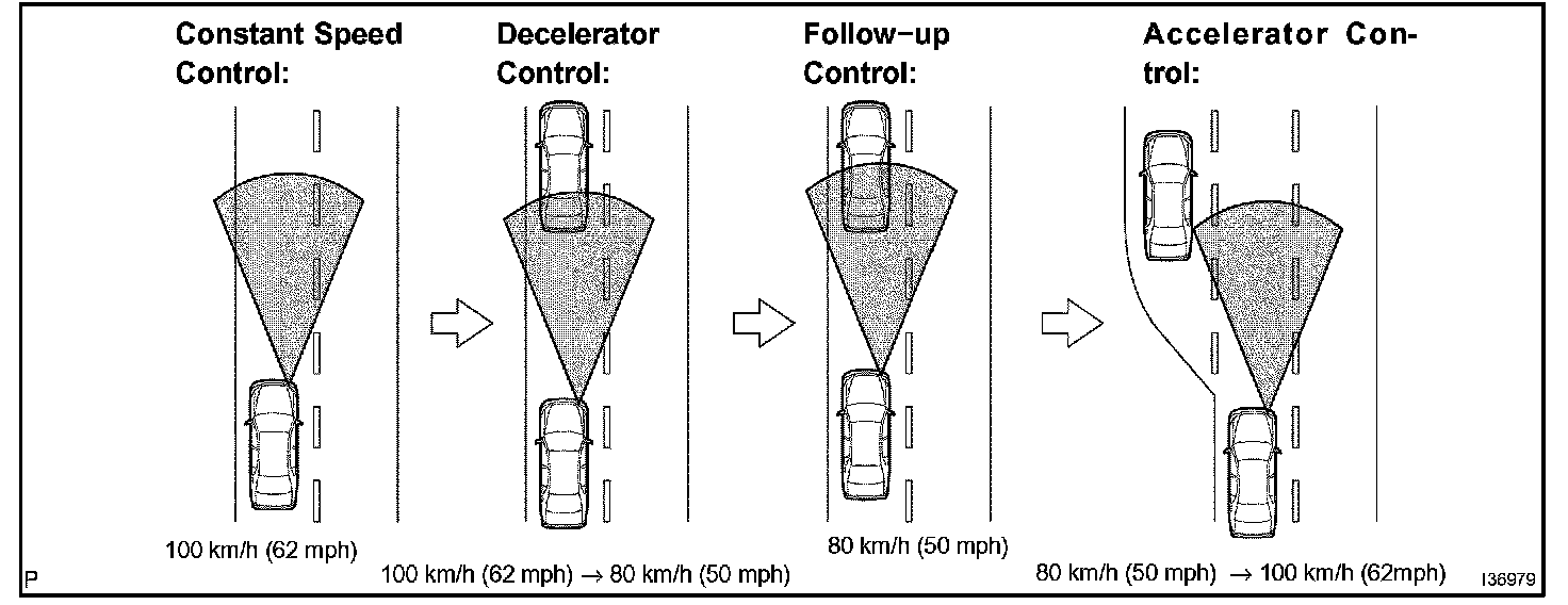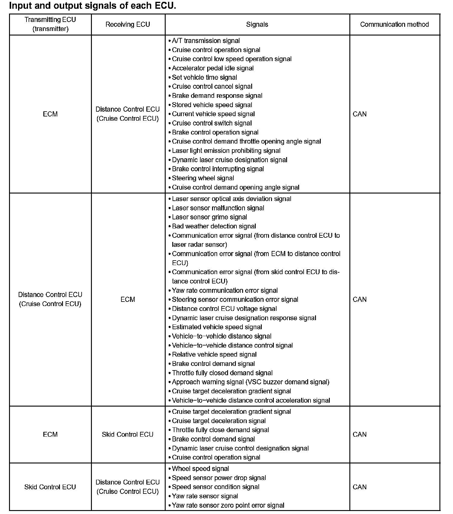 The distance control ECU (cruise control ECU) determines the distance between a vehicle in front and your own, relative speed, target decreasing speed and deceleration rate to transmit a brake demand signal to the skid control ECU via ECM.