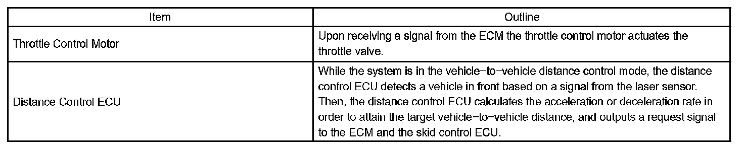 d. The laser sensor and the distance control ECU (cruise control ECU) control the system while the vehicle-to-vehicle distance control mode is in operation, and send signals to each actuator and ECU.