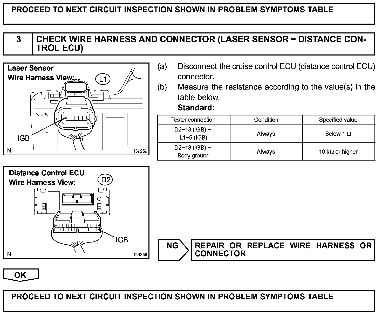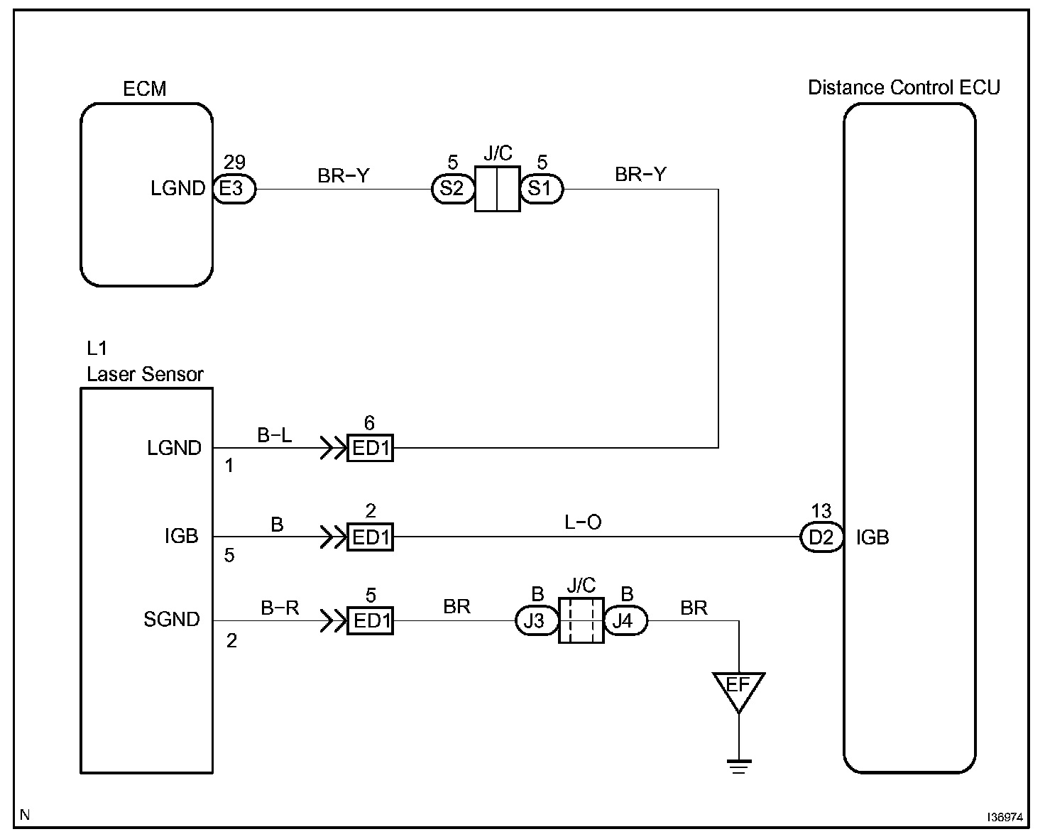 The laser sensor emits laser beams towards an object in front and measures the distance and direction of the object by receiving the beam reflections. Based on the reflections, the sensor calculates the difference in speed between your own vehicle and an object in front. This data is transmitted to the cruise control ECU (distance control ECU).