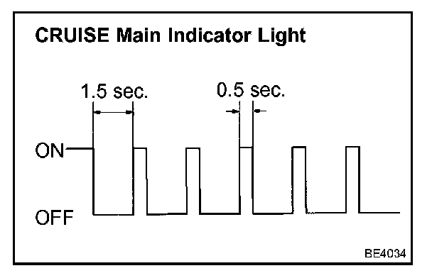 HINT: If a malfunction occurs in the vehicle speed sensors, the stop lamp switch, or other related parts during cruise control driving, the ECU actuates AUTO CANCEL of the cruise control and blinks the CRUISE main indicator light. This indicator light informs the driver of the malfunction. At the same time, the malfunction is stored as a diagnostic trouble code.
