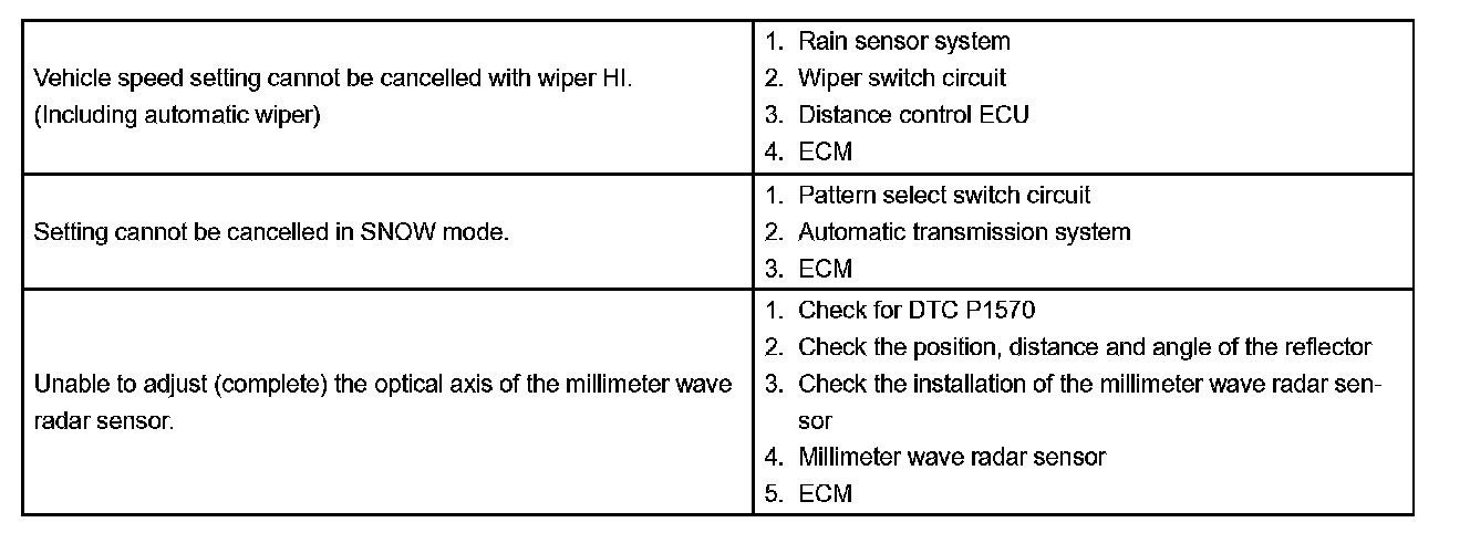 If a normal system code is displayed during the DTC check but the problem still occurs, check the suspected areas for each problem symptom in the order given in the table and proceed to the relevant troubleshooting.