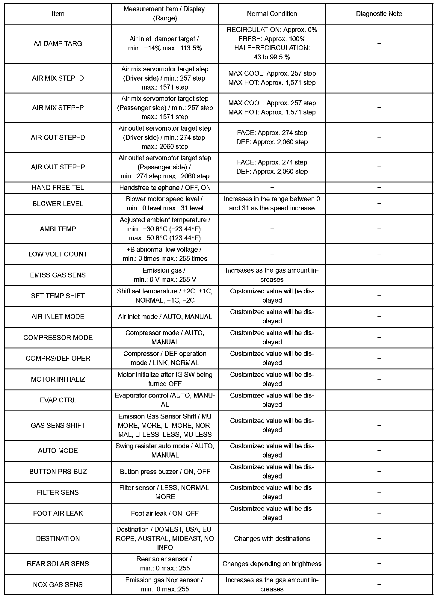 DATA LISTHINT: From the DATA LIST displayed on the hand-held tester, you can read the values of the displays, sensors, actuators and so on without parts removal. Reading the DATA LIST as the first step of troubleshooting is one way to shorten labor time.