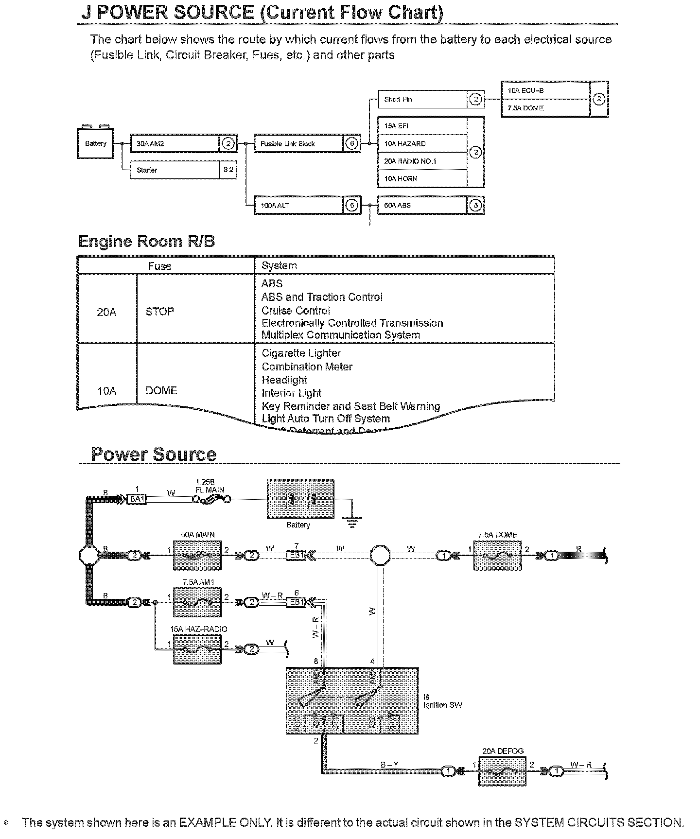HOW TO READ POWER SOURCEThe "Current Flow Chart" section, describes which parts each power source (fuses, fusible links, and circuit breakers) transmits current to. In the Power Source circuit diagram, the conditions when battery power is supplied to each system are explained. Since all System Circuit diagrams start from the power source, the power source system must be fully understood.