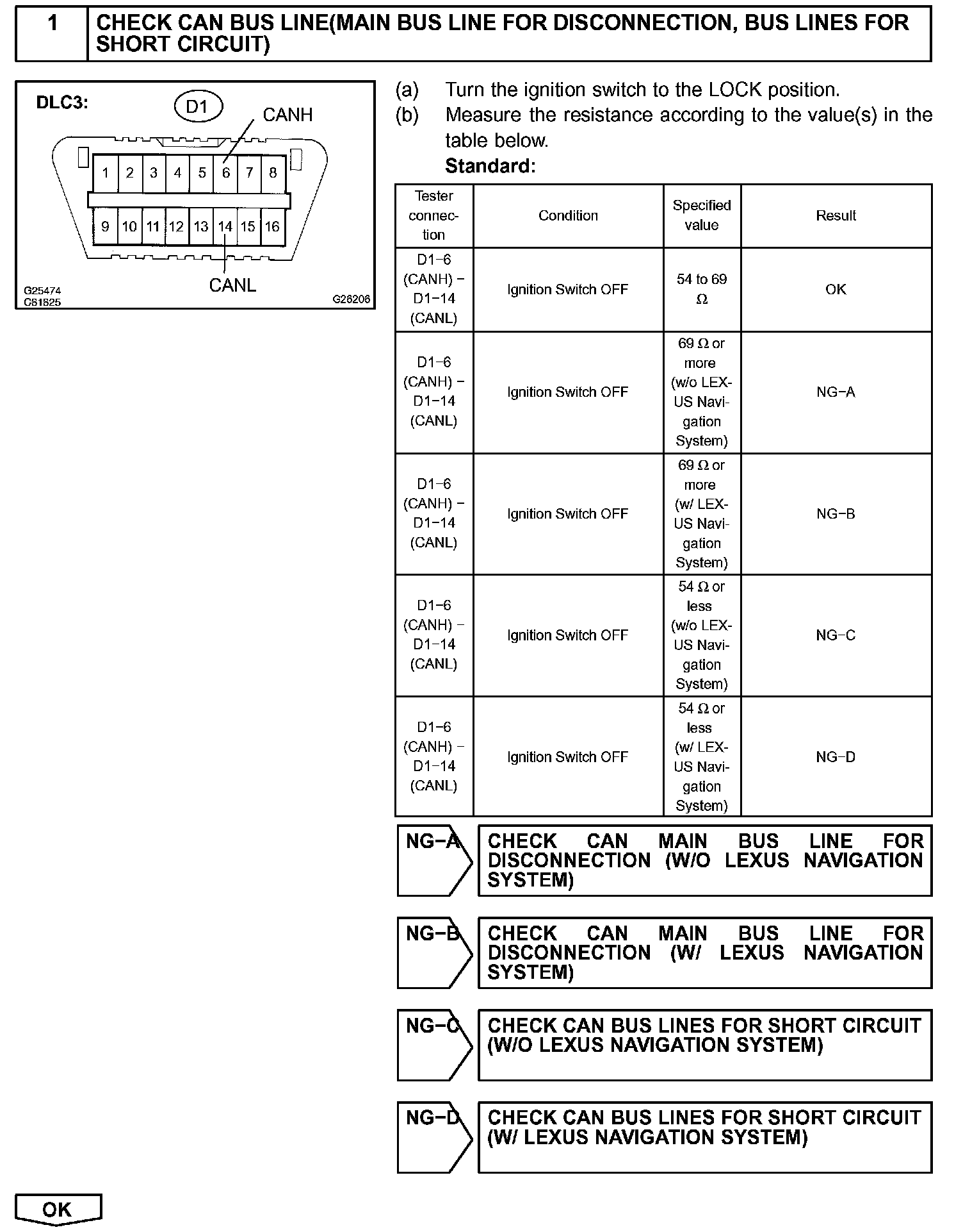 When any DTC for the CAN communication system is output, first measure the resistance between the terminals of the DLC3 to specify the trouble area, and check that there is no short in the CAN main bus line, between the CAN bus lines, to +B, or to GND.