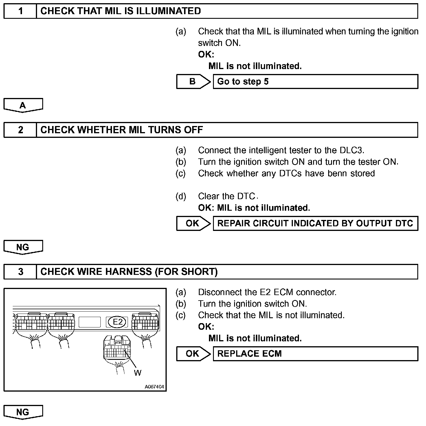 If the ECM detects trouble, the MIL illuminates. At this time, the ECM records a DTC in the memory.