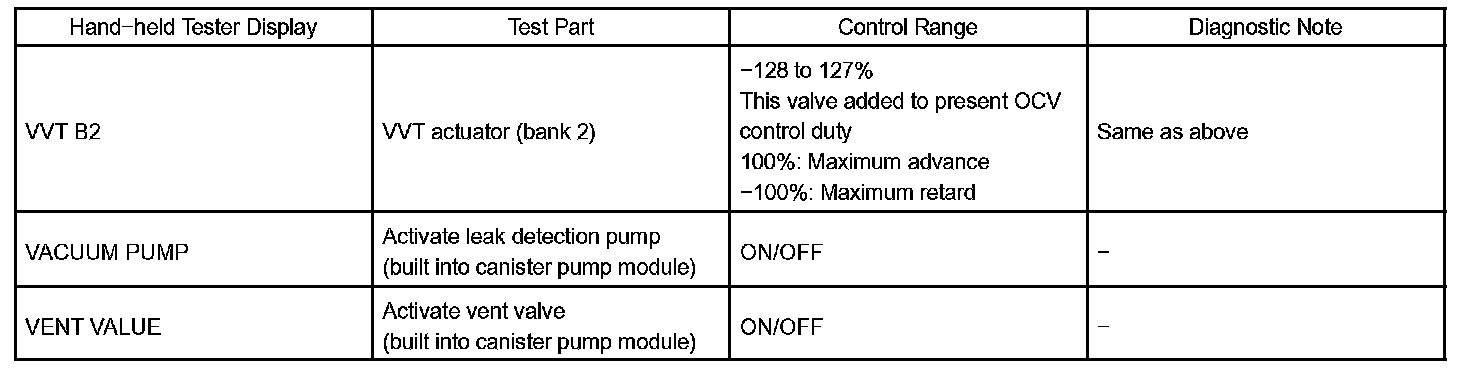 ACTIVE TESTHINT: Performing the hand-held tester's ACTIVE TEST allows relay, Vacuum Switching Valve (VSV), actuator and other items to be operated without removing any parts. Performing the ACTIVE TEST early in troubleshooting is one way to save time. The DATA LIST can be displayed during the ACTIVE TEST.