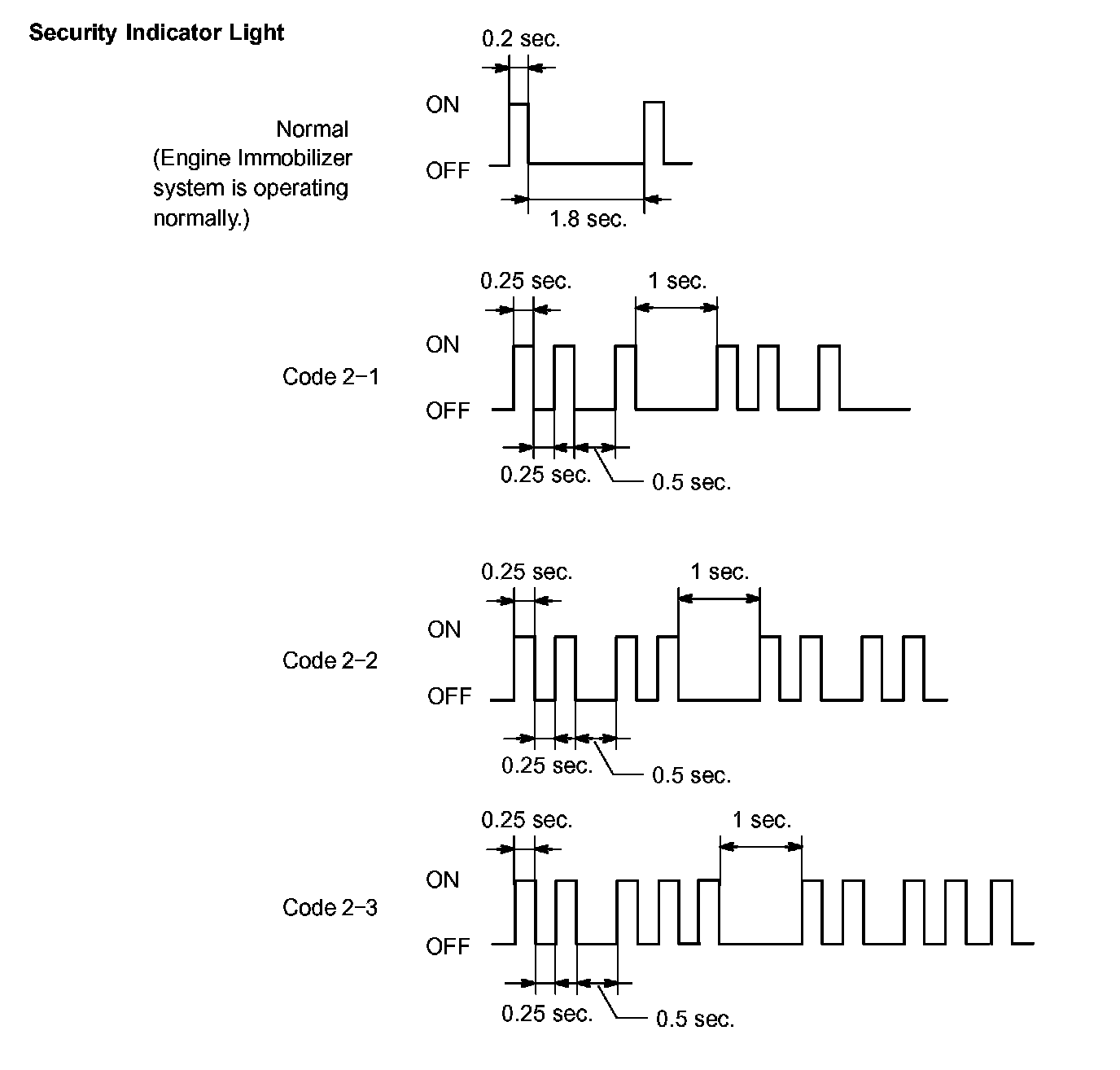 If the key code registration has failed in automatic key code registration mode, code 2-1 will be output from the security indicator light. Trying to reregister an already registered key will cause code 2-2 to be output when the key is inserted. If the number of registered key codes exceeds the limit, code 2-3 will be output from the security indicator light. The output details are shown as given.