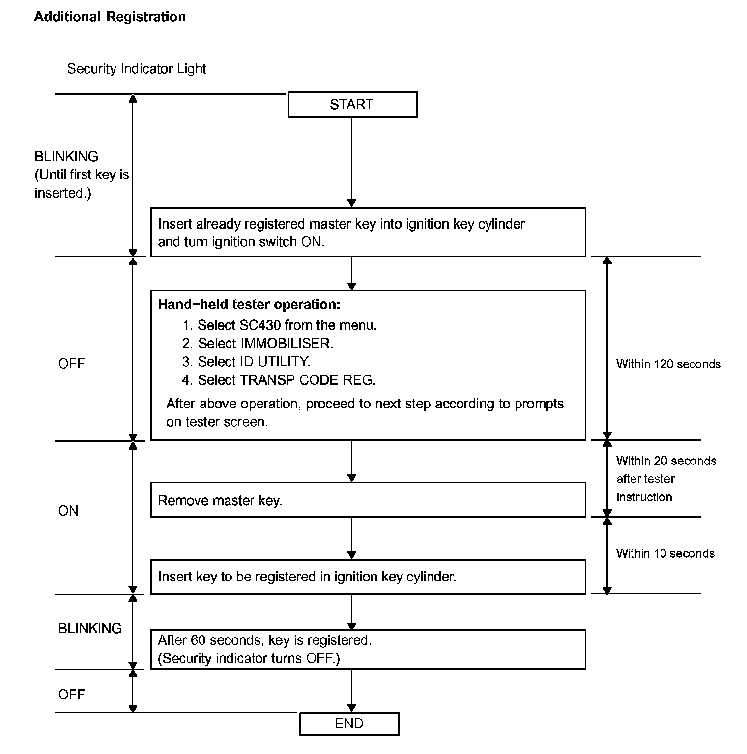 1. Turn the ignition switch ON and OFF 5 times within 10 seconds using the already registered master key.