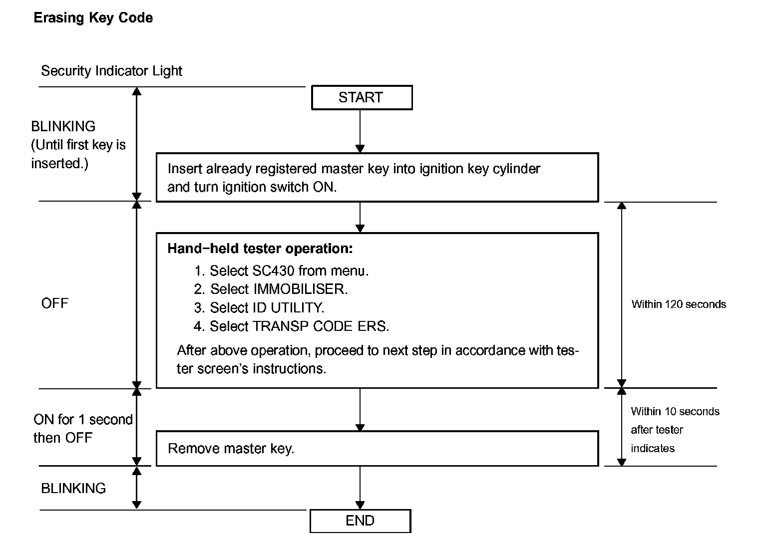 - A brief outline of the procedures for key code erasure are shown on this image. For more detailed information, please refer to the hand-held tester screen's instructions.