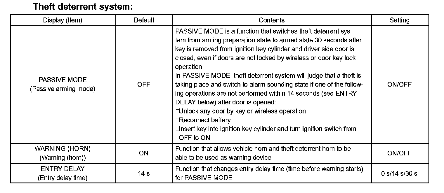 - When troubleshooting a function, first make sure that the function is set to the default setting. Theft deterrent system: