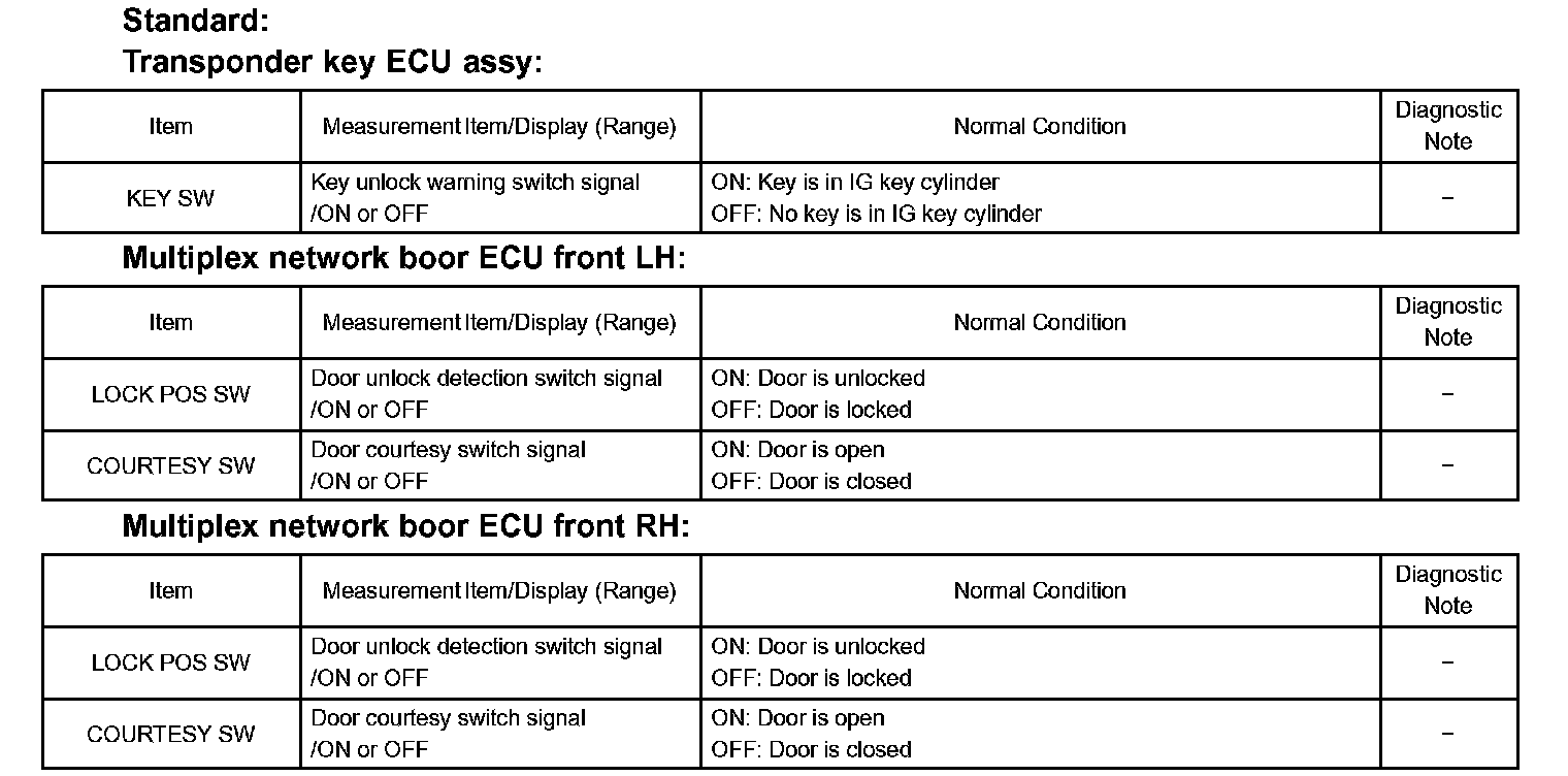DATA LISTHINT: Using the hand-held tester's DATA LIST allows switch, sensor, actuator and other item values to be read without removing any parts. Reading the DATA LIST early in troubleshooting is one way to save time.
