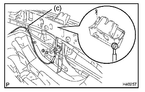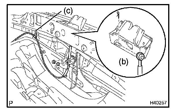 b. Remove the lock and lift it upward. Move the hinge to the position where the door is in the fully open condition from the front, and disconnect the luggage opener cable.