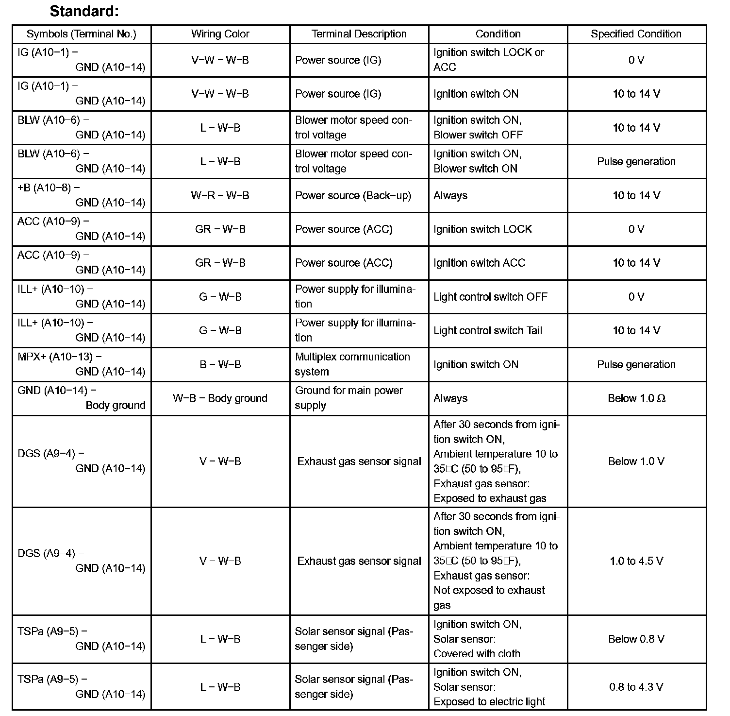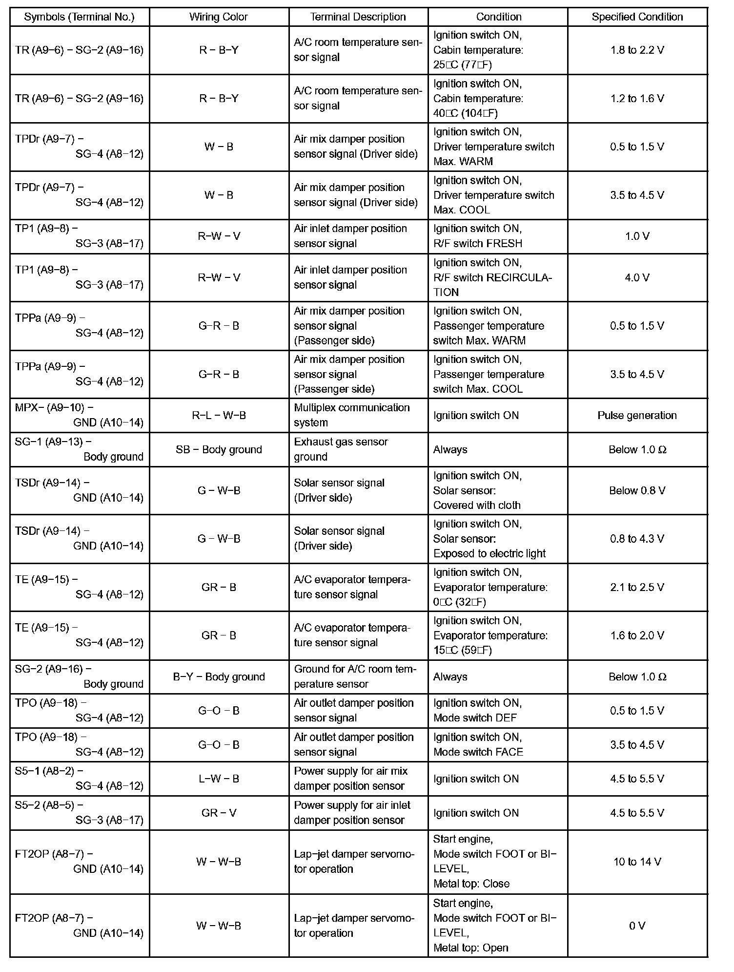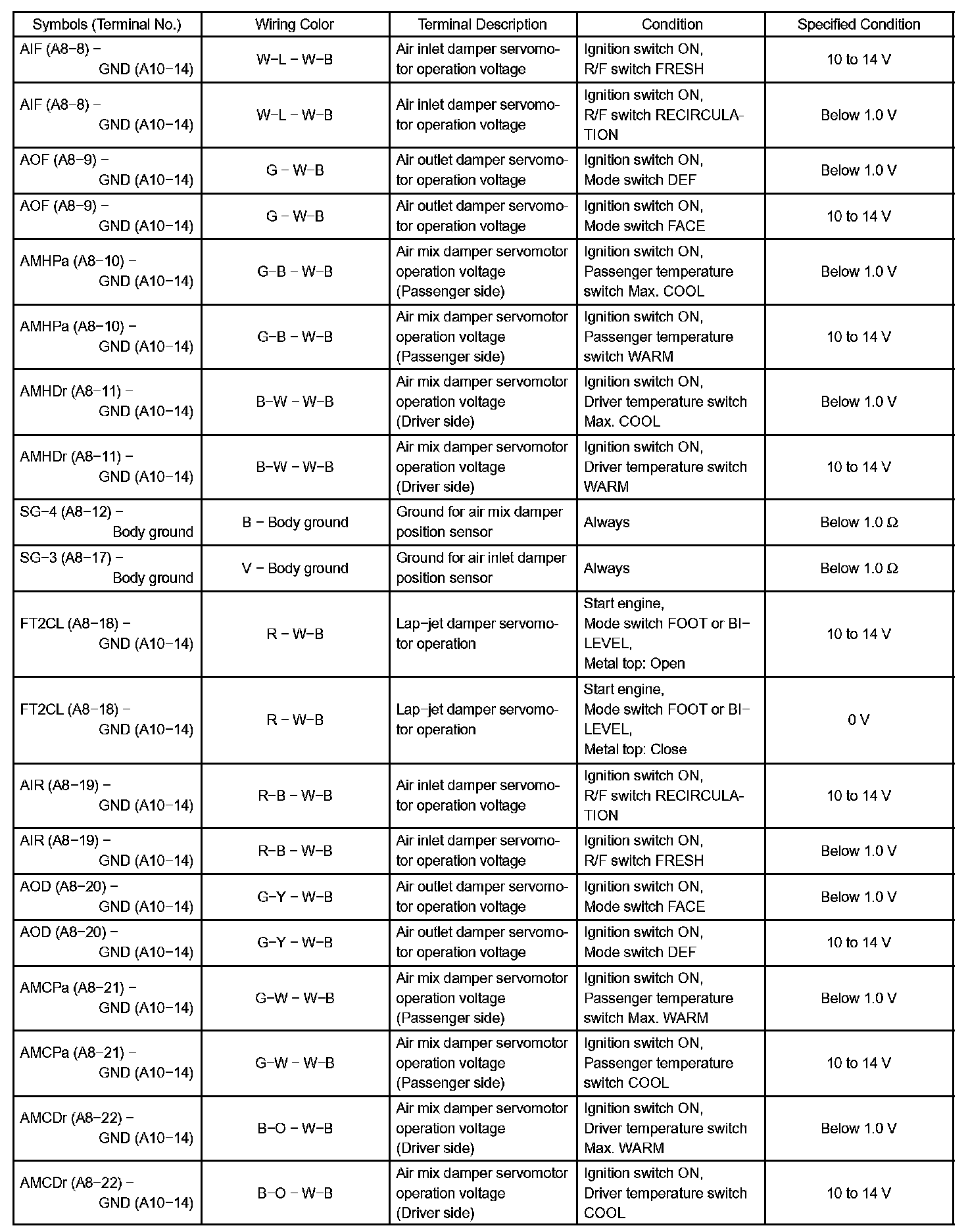 a. Measure the voltage and resistance of the connectors. If the result is not as specified, the A/C amplifier may have a malfunction.