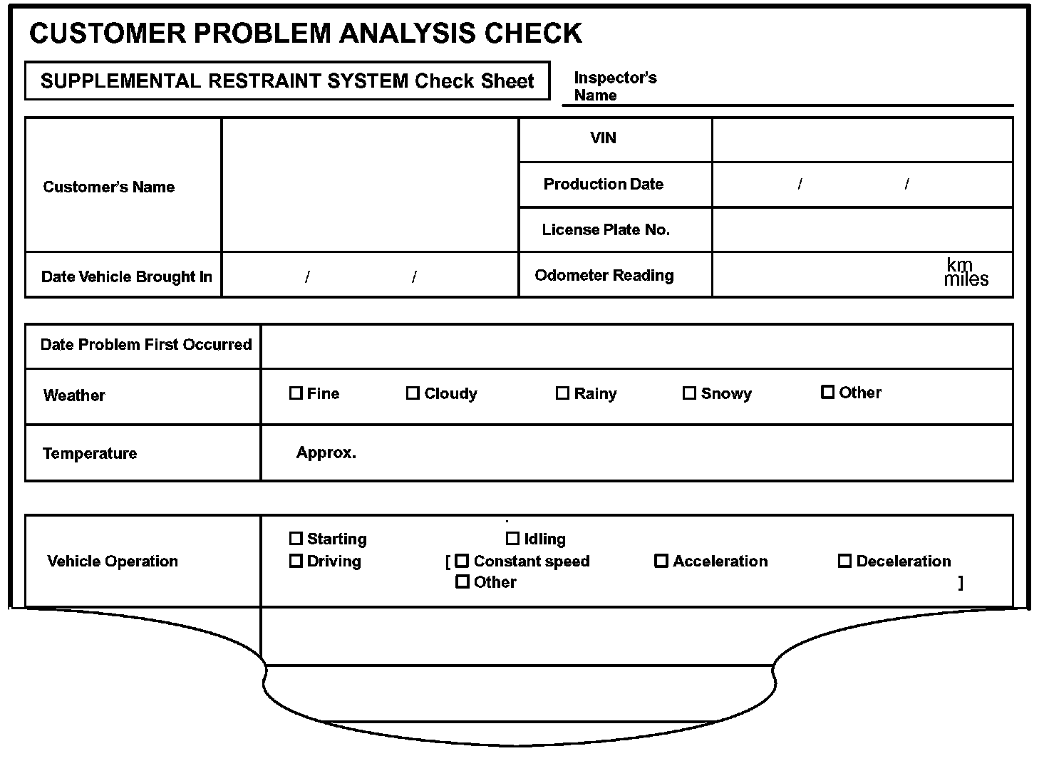 Supplemental Restraint System Check Sheet:
