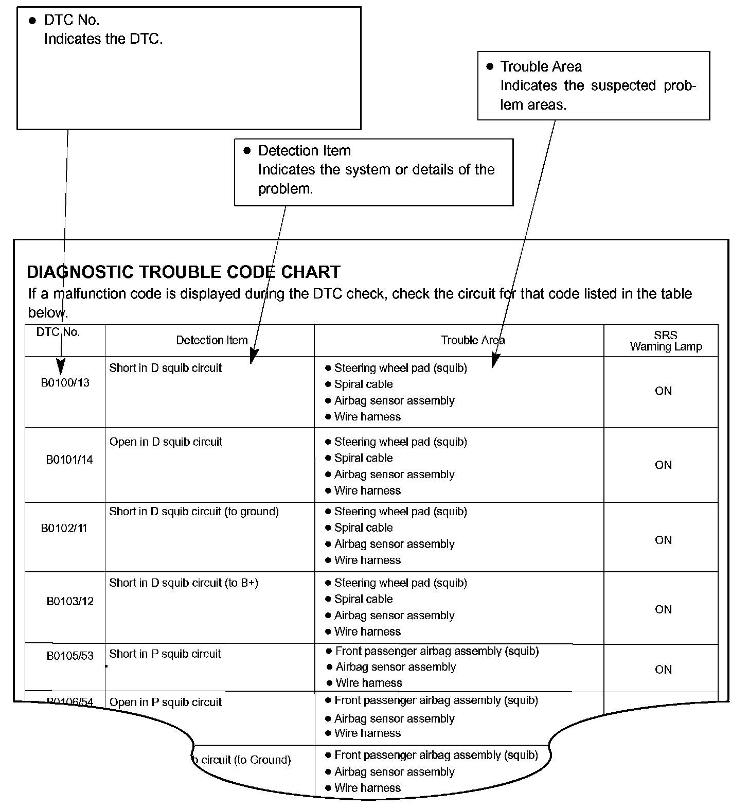 DIAGNOSTIC TROUBLE CODE CHARTUse Diagnostic Trouble Codes (DTCs) (from the DTC checks) in the table below to determine the trouble area and proper inspection procedure. The Supplemental Restraint System (SRS) DTC chart is shown as an example.