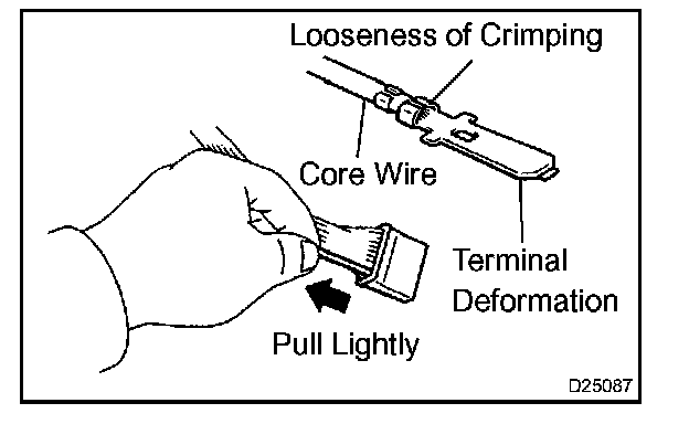 Check by pulling the wire harness lightly from the backside of the connector. Look for unlatched terminals, missing terminals, loose crimps or broken conductor wires. Visually check the connector for any of the following: