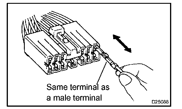 3. Checking the contact pressure of the terminal: Prepare a spare male terminal. Insert it into a female terminal, and check for ample tension when inserting and after full engagement.