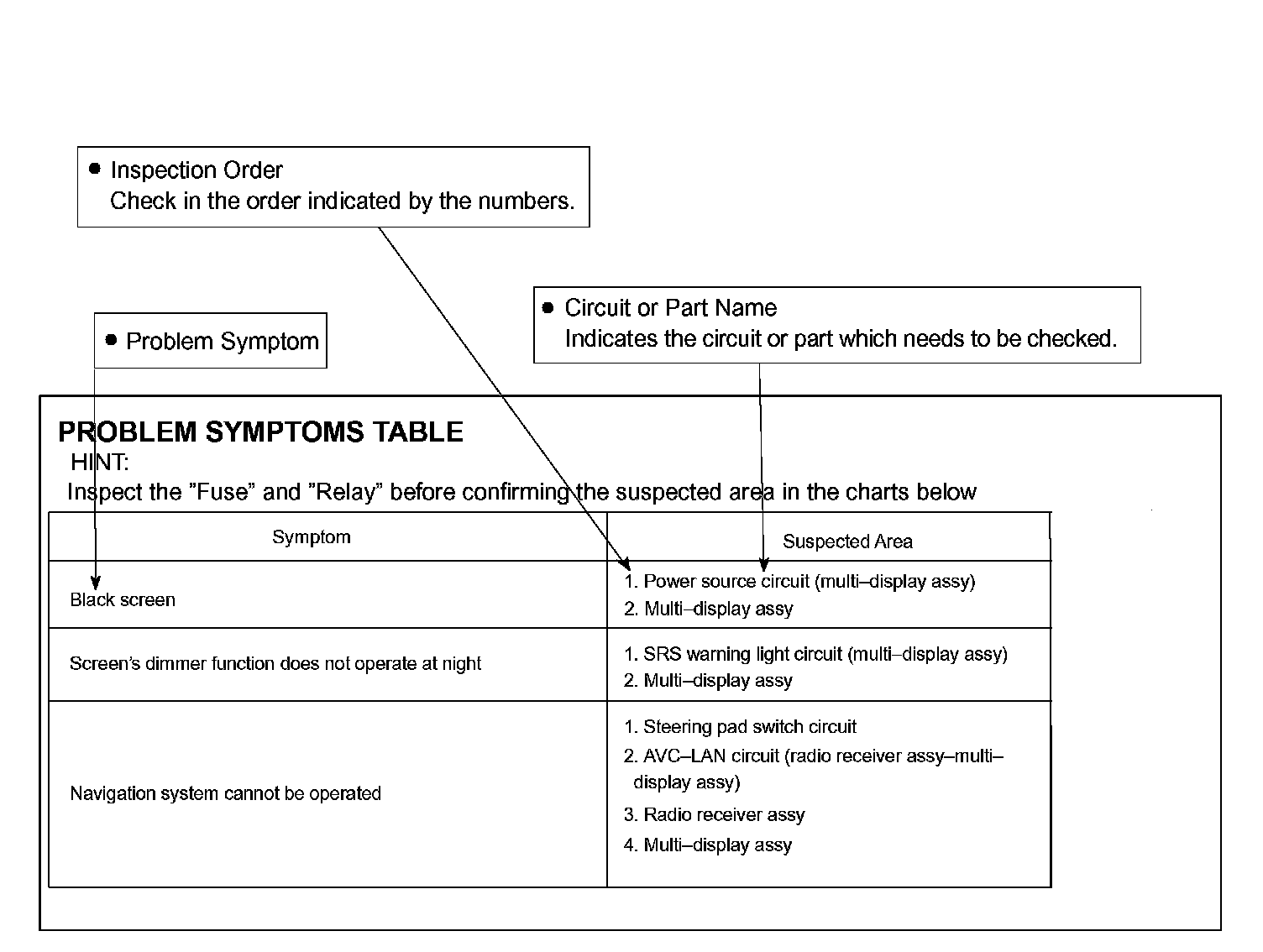 The suspected circuits or parts for each problem symptom are shown in the table. Use this table to troubleshoot when, during a DTC check, a Normal code is displayed but the problem is still occurring. Numbers in the table show the inspection order in which the circuits or parts should be checked.