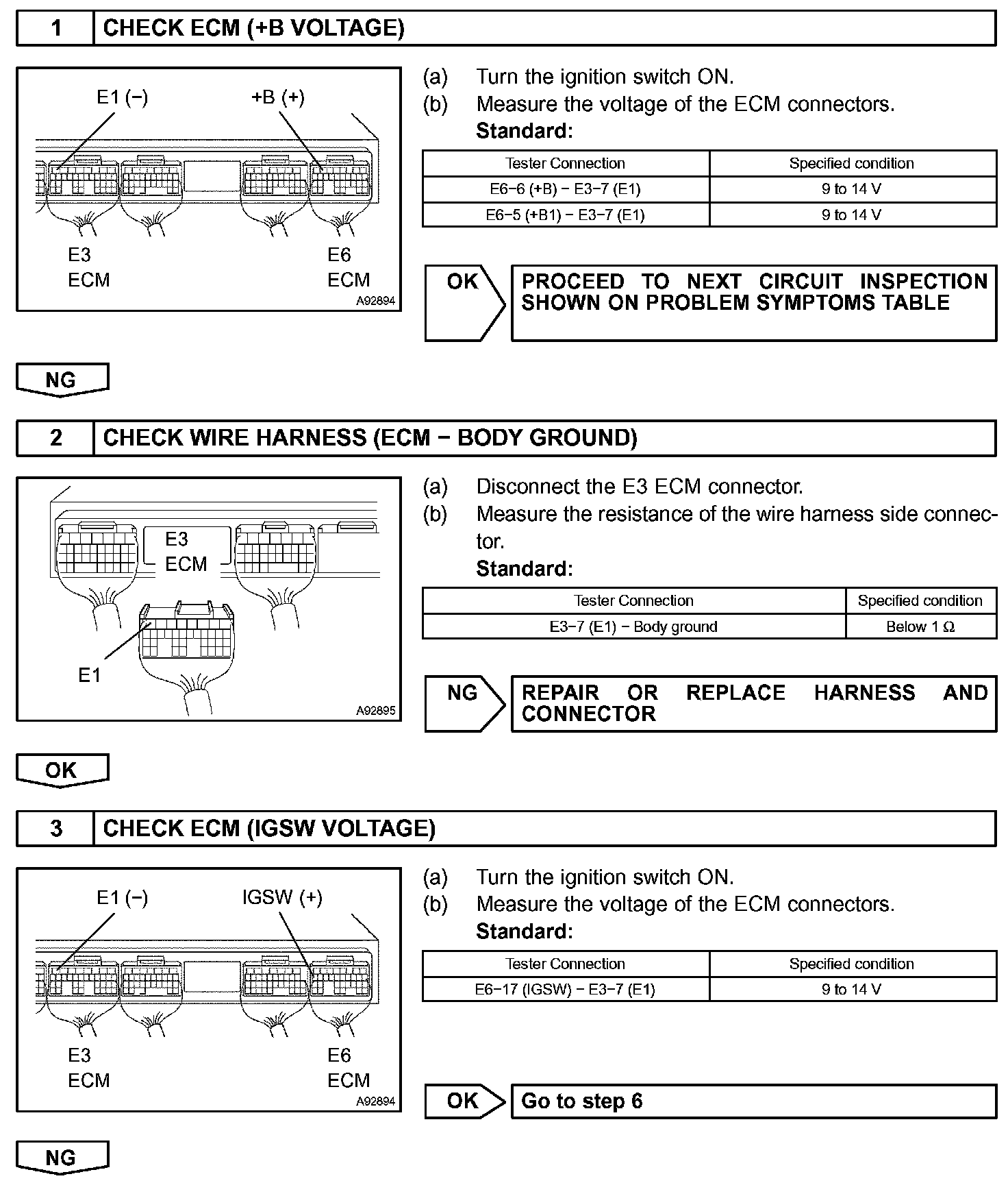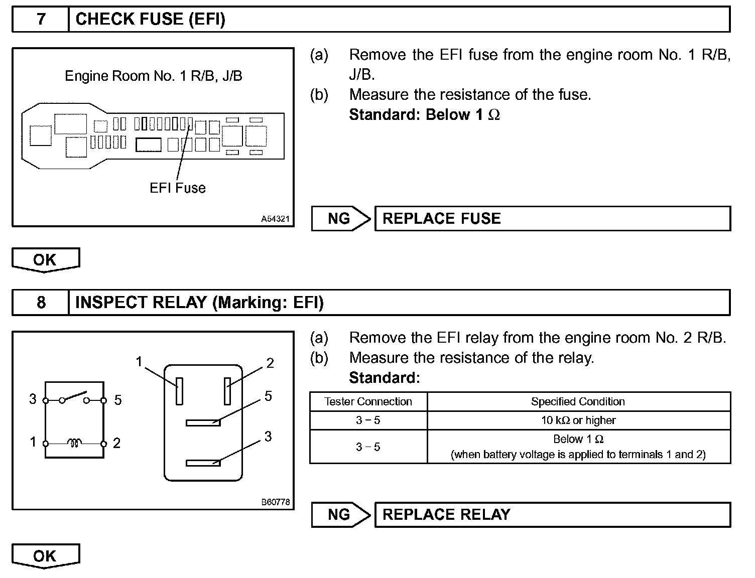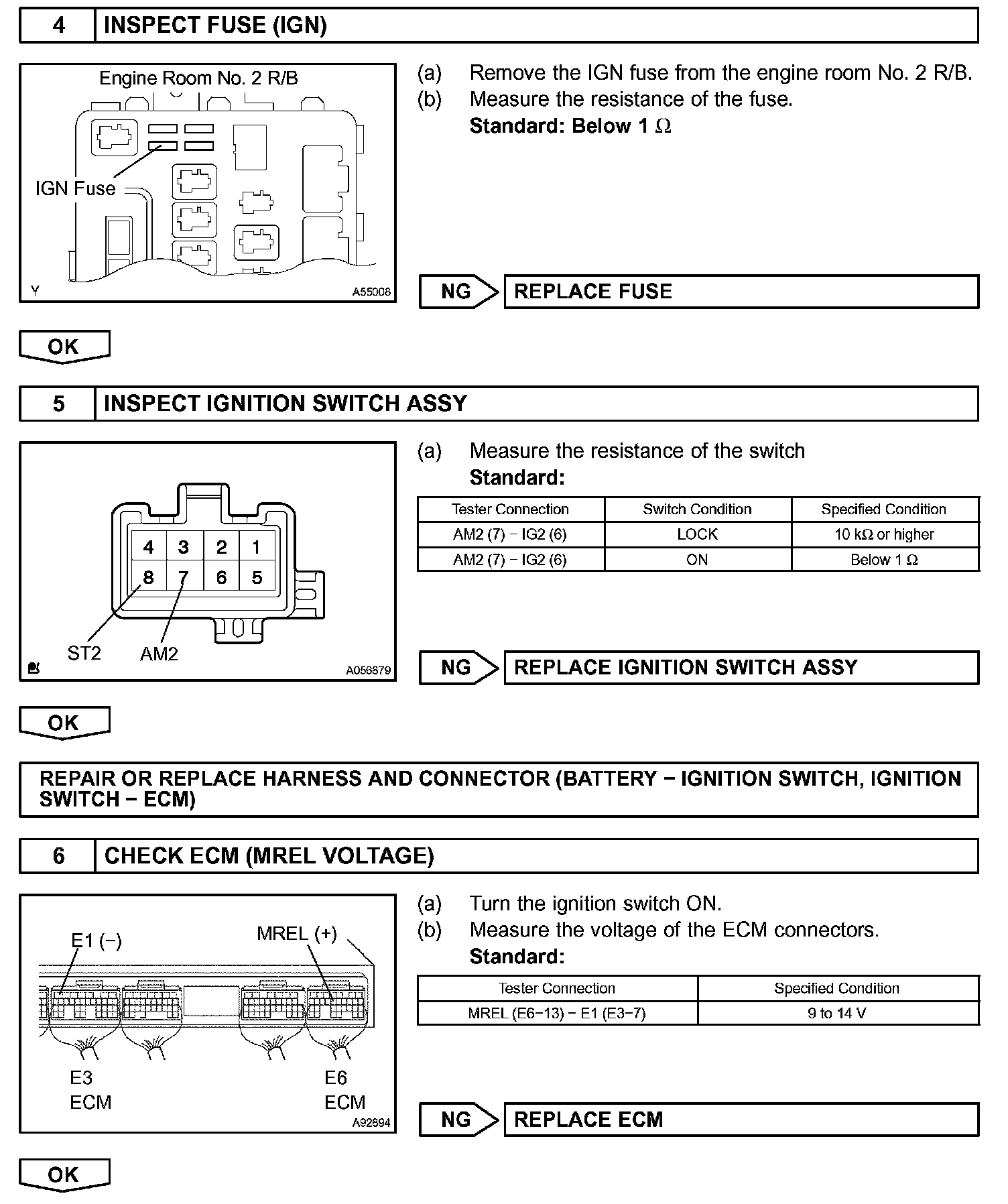When the ignition switch is turned ON, battery voltage is applied to terminal IGSW of the ECM. The ECM "MREL" output signal causes current to flow to the coil, closing the contacts of the EFI relay and supplying power to terminal +B of the ECM.