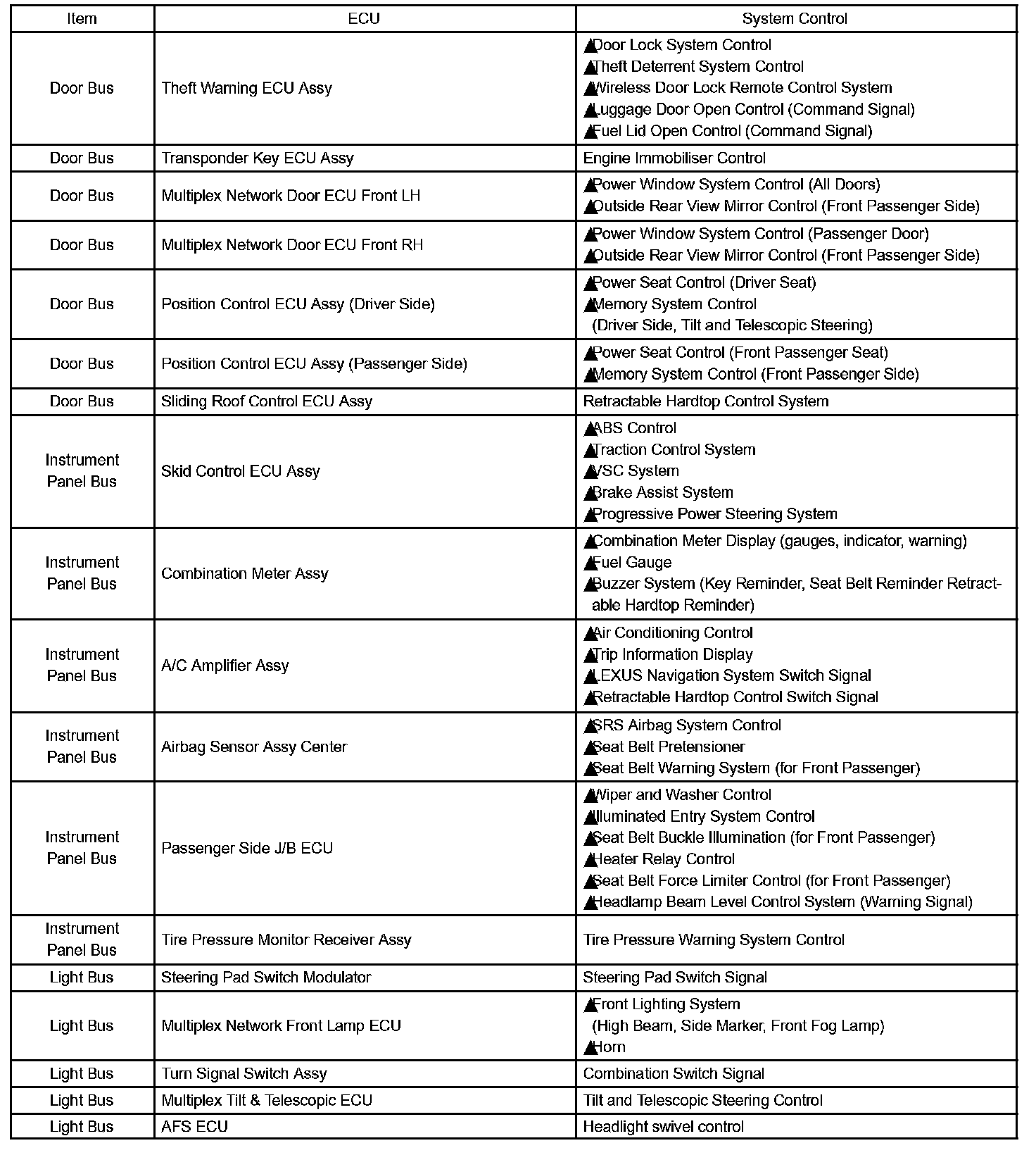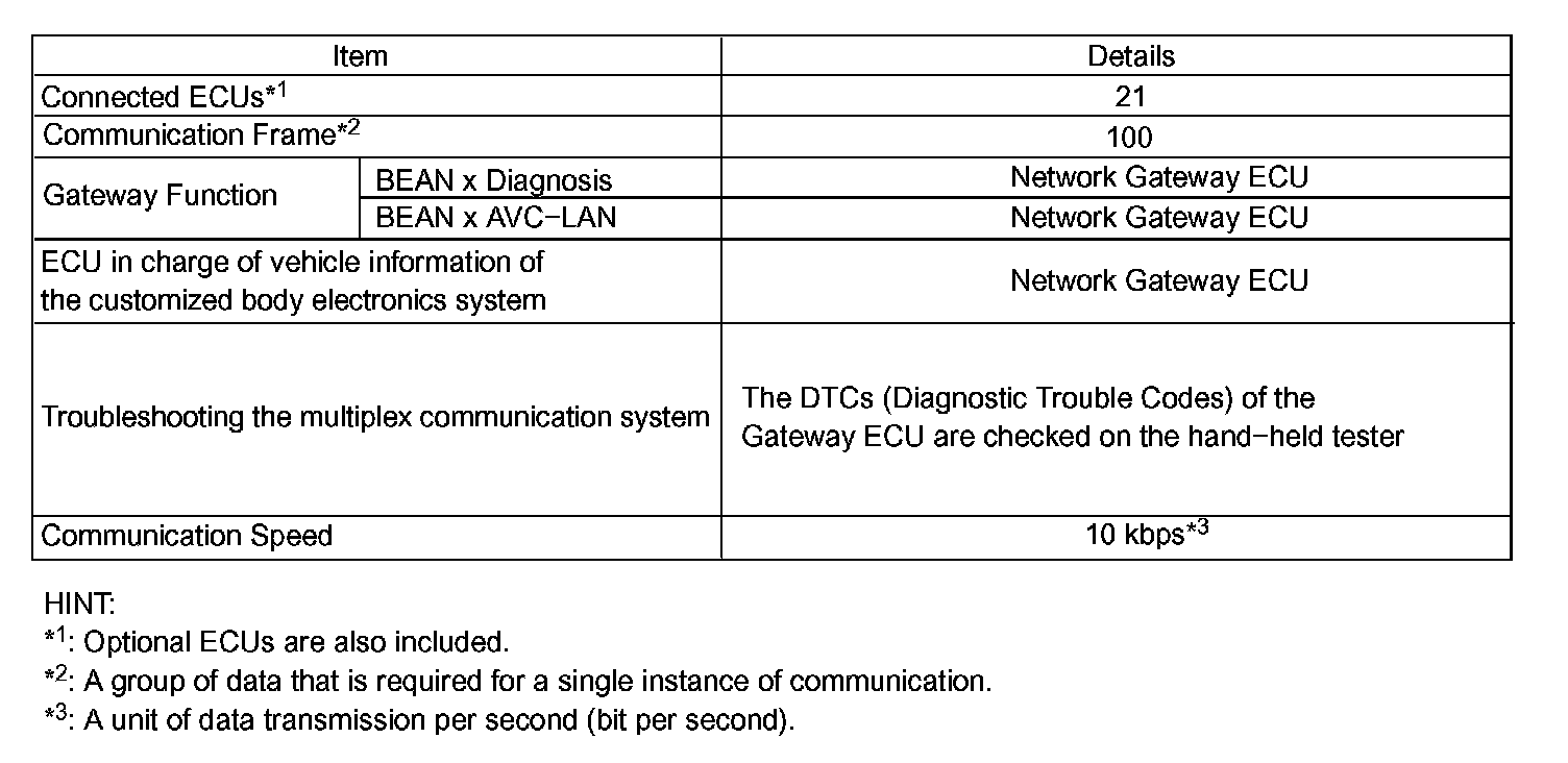 - The Gateway ECU connects the buses, AVC-LAN, and DLC3 (Data Link Connector 3), and manages the communication among them.
