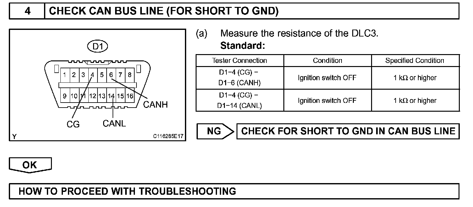 When any DTC for the CAN communication system is output, first measure the resistance between the terminals of the DLC3 to specify the trouble area, and check that there is no short in the CAN main bus line, between the CAN bus lines, to B+, or to GND.