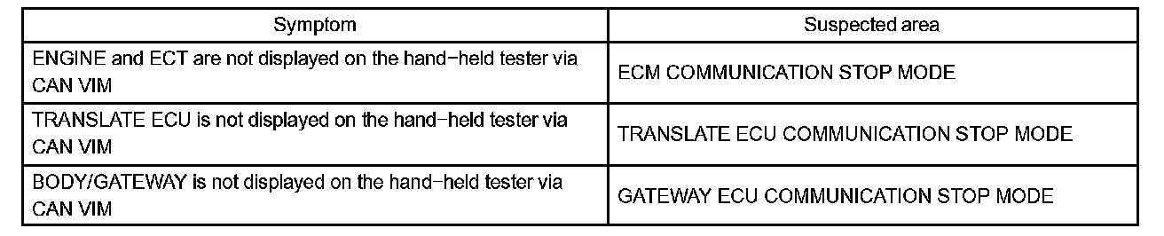 b. Check the communication stop mode of the ECUs not displayed among the following "ENGINE", "ECT", "BODY/GATEWAY", "TRANSLATE ECU".