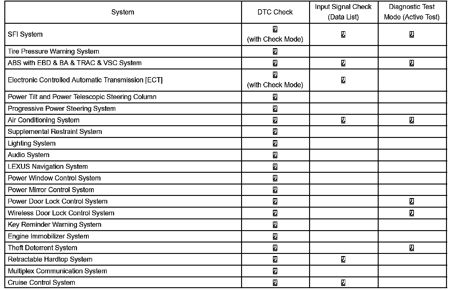 By using these functions, the problem areas can be narrowed down and troubleshooting is more effective. Diagnostic functions are incorporated in the following systems in the LEXUS SC 430: