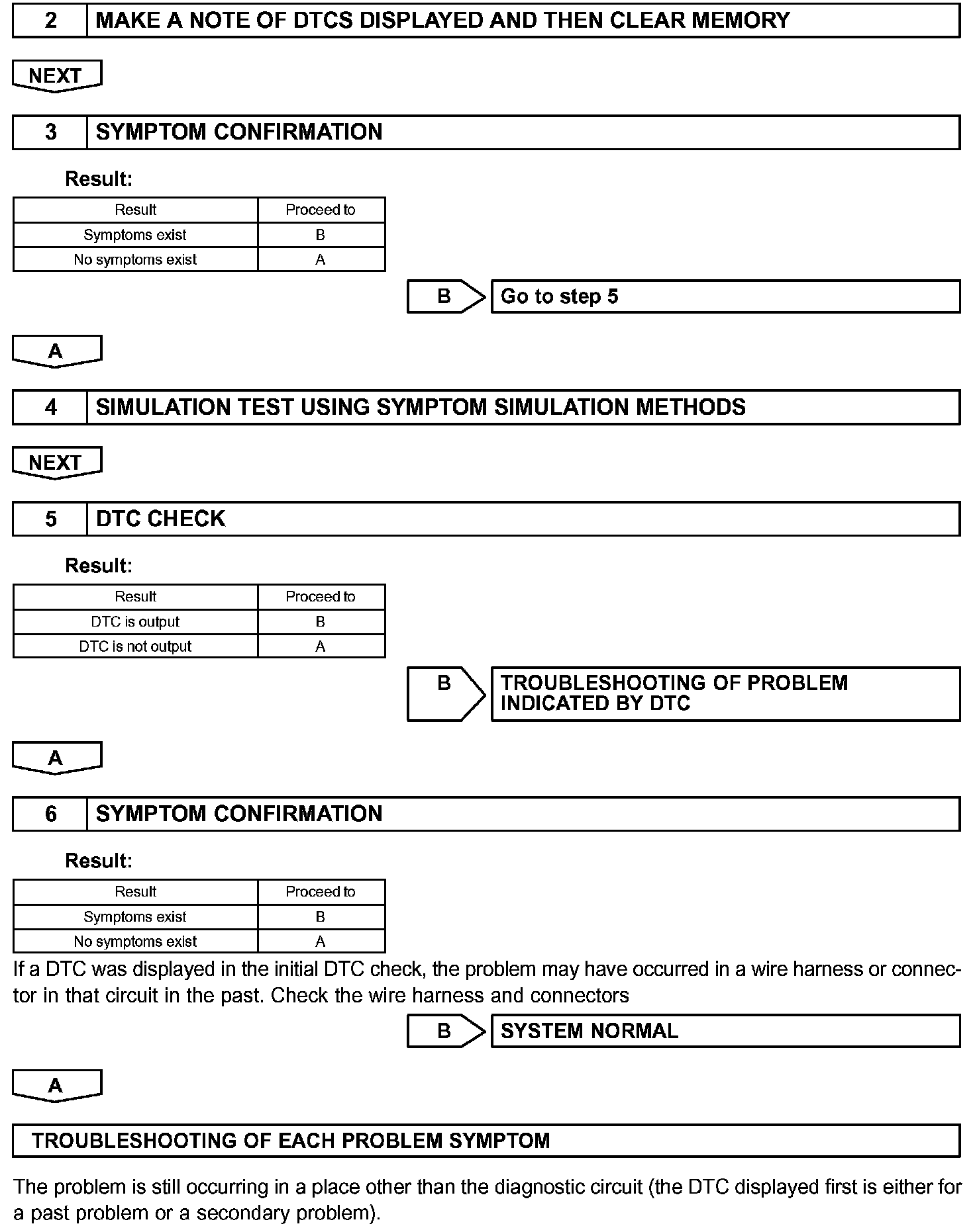 - In the DTC check, it is very important to determine whether the problem indicated by the DTC is either: 1) still occurring, or 2) occurred in the past but has since returned to normal. In addition, the DTC should be compared to the problem symptom to see if they are related. For this reason, DTCs should be checked before and after confirmation of symptoms (i.e., whether or not problem symptoms exist) to determine current system conditions, as shown in the flowchart. Never skip the DTC check. Failing to check DTCs may, depending on the case, result in unnecessary troubleshooting for systems operating normally or lead to repairs not pertinent to the problem. Follow the procedures listed in the flowchart in the correct order.
