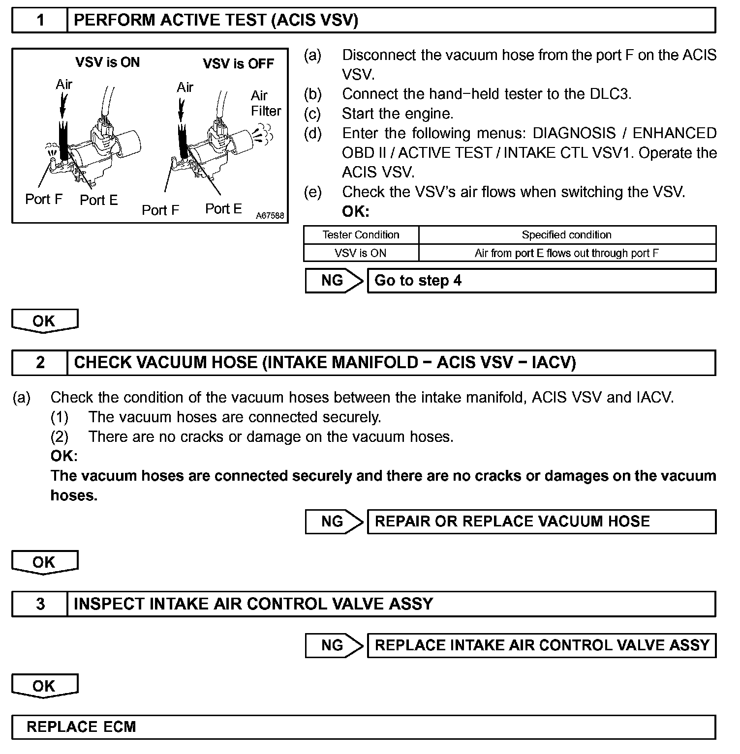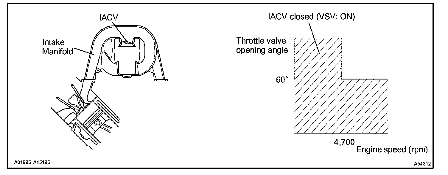When the engine speed is 4,700 rpm or more and the throttle valve opening angle is 60 Degrees or more, the VSV is OFF, so the IACV is open. All the other times, the ECM turns the VSV ON and closes the IACV.
