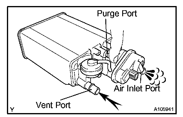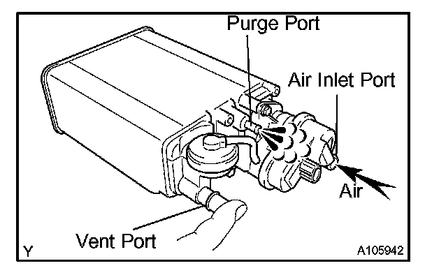 2. With the vent port closed, below 0.39 kPa (0.0039 kgf/sq.cm, 0.05 psi) of air into the air inlet port, and check that air flows from the purge port.