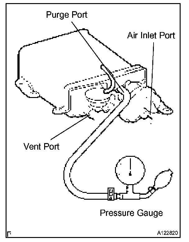1. With the purge port closed, below 0.39 kPa (4.0 kgf/sq.cm, 0.06 psi) of air into the vent port, and check that air flows from the air inlet port.