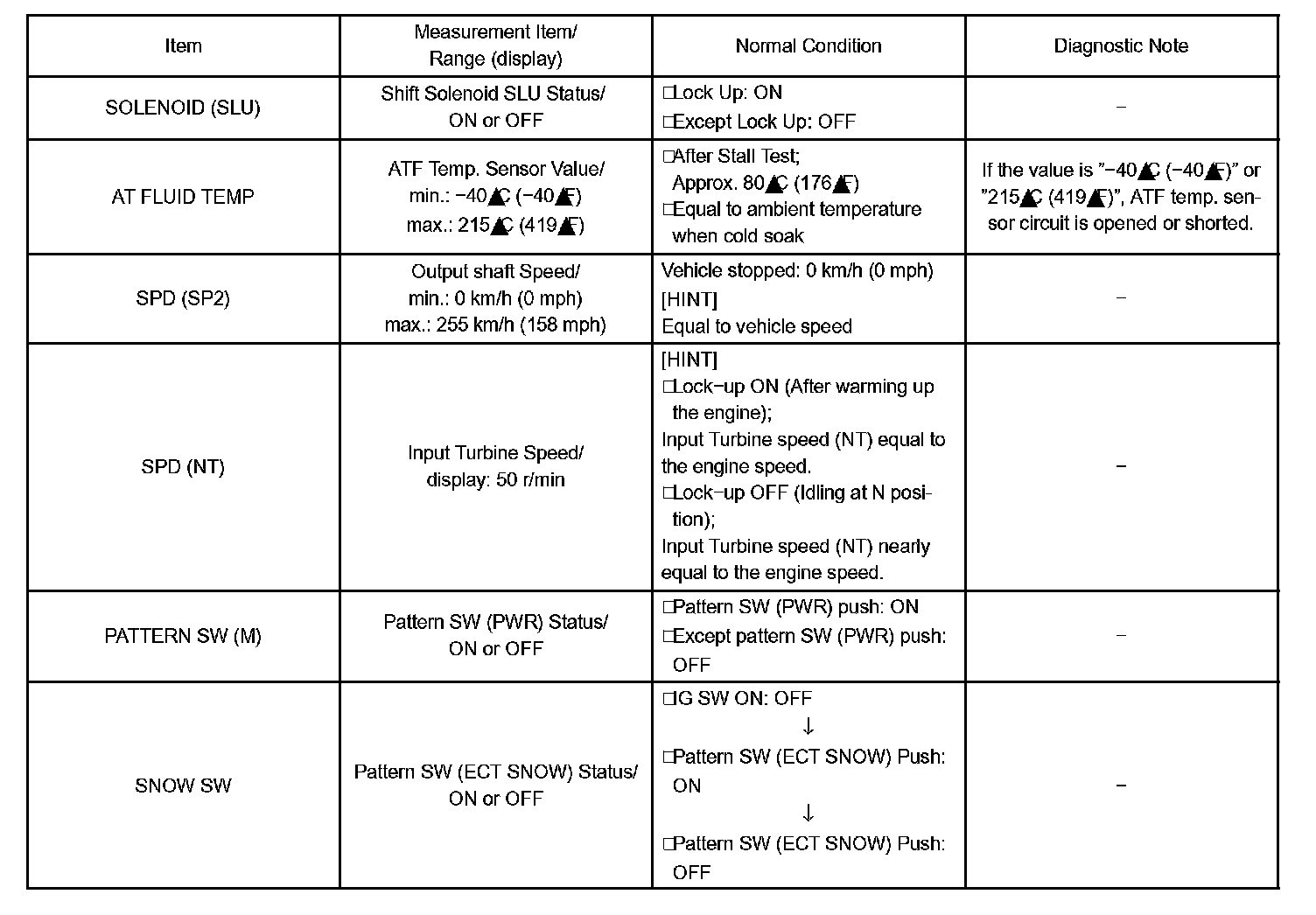 NOTE: In the table below, the values listed under "Normal Condition" are reference values. Do not depend solely on these reference values when deciding whether a part is faulty or not.