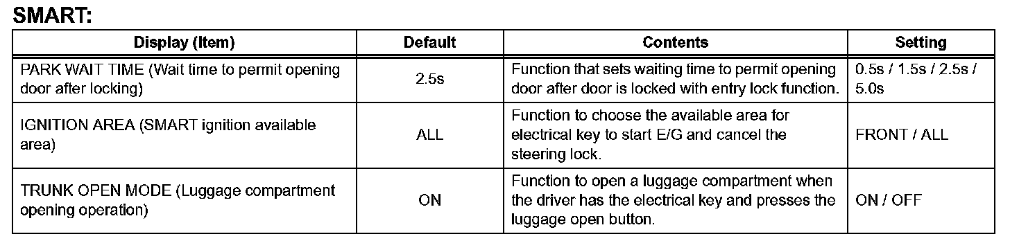 HINT: The function only changes the entry unlock mode of the smart access system with push-button start. It does not switch the unlocking of the wireless door lock control.