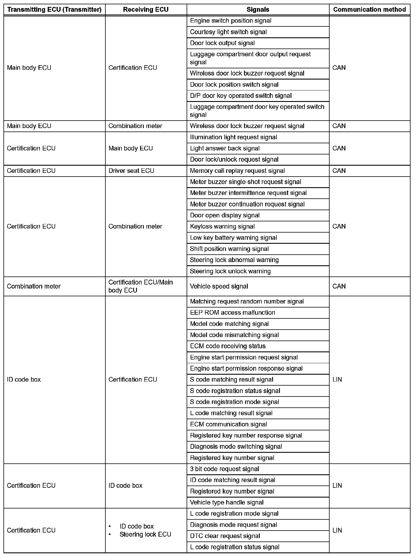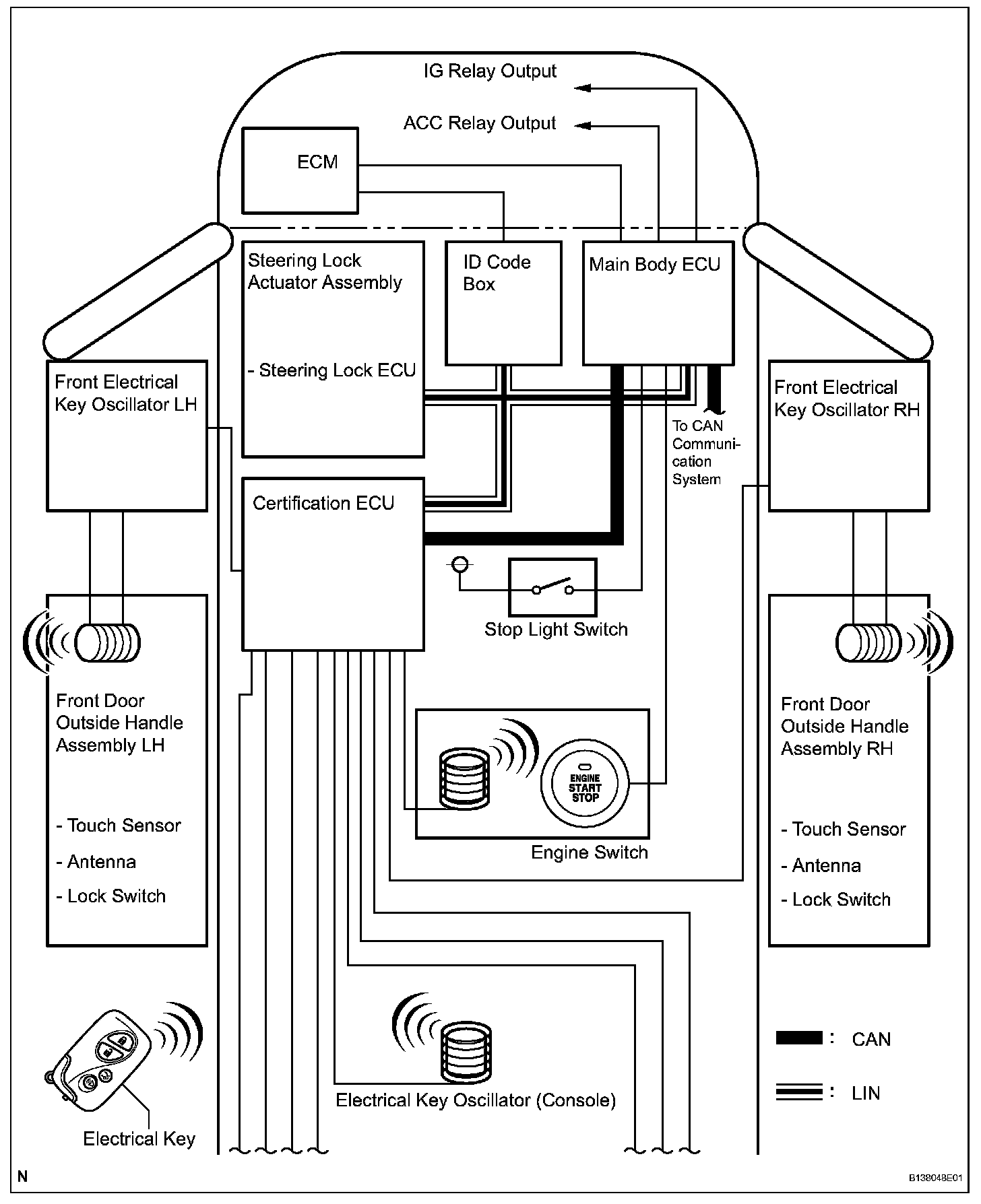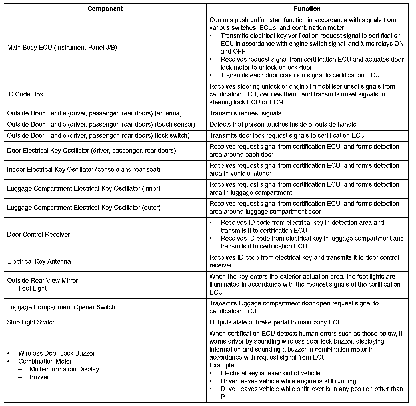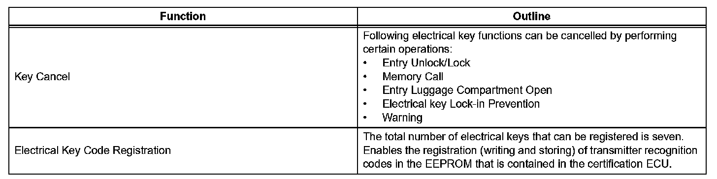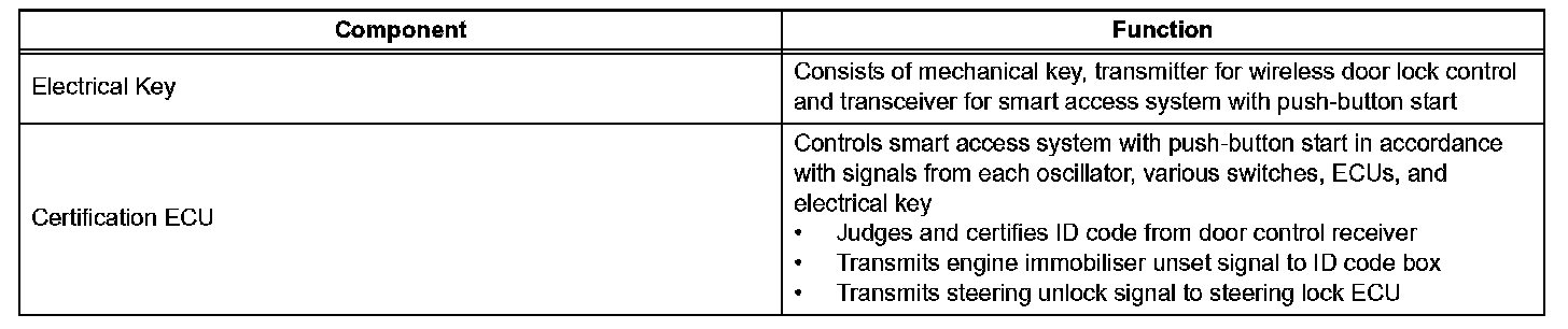 - This system is controlled by the certification ECU. When the certification ECU detects the presence of the an electrical key in one of the detection areas, it identifies and checks the ID code, and outputs operation signals to the related ECU in accordance with their functions.