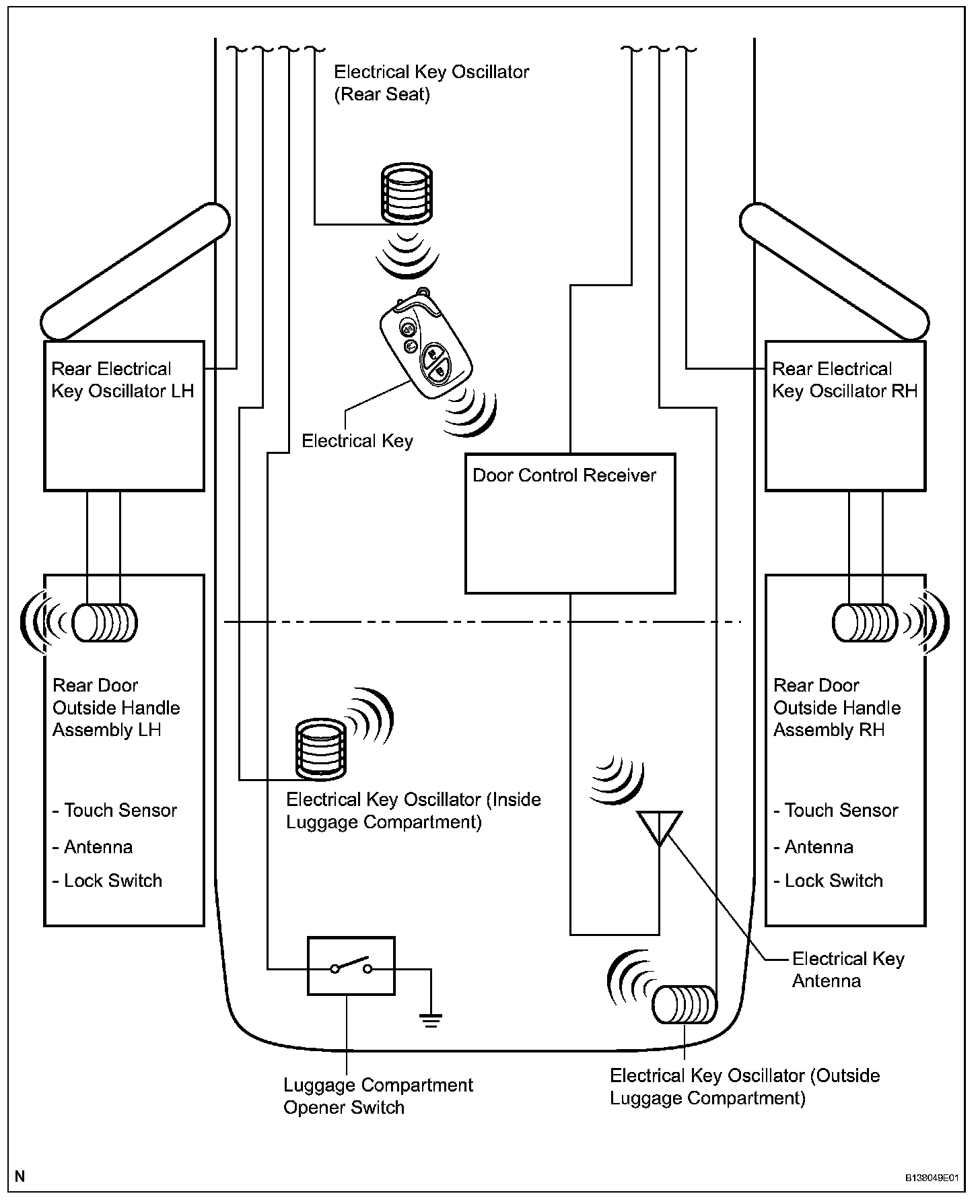 - The detection area of the luggage compartment inner oscillator is formed when the luggage compartment door is closed, entry luggage compartment open, electrical key lock-in prevention the luggage compartment open switch or lock switch is pressed.