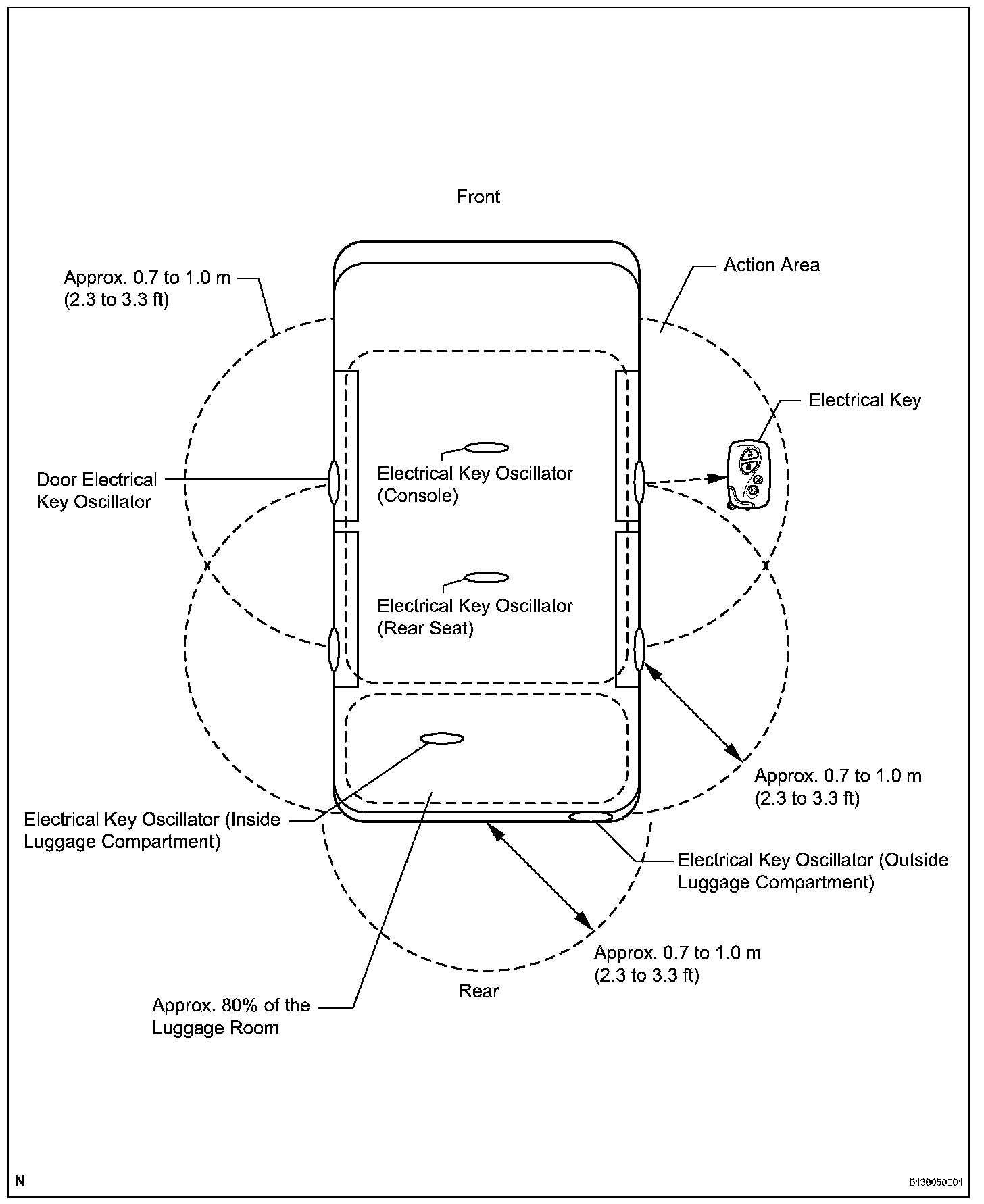 Each oscillator transmits the request signal received from the certification ECU, and forms an electrical key detection area to detect the presence of an electrical key. The detection area formed by each door oscillator and luggage compartment outer oscillator is approximately 0.7 to 1.0 m (2.3 to 3.3 ft) from the outside handle of each door or the center of the rear bumper.