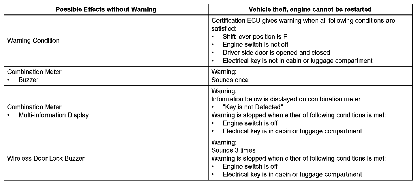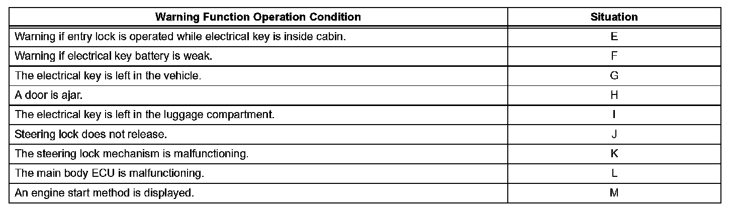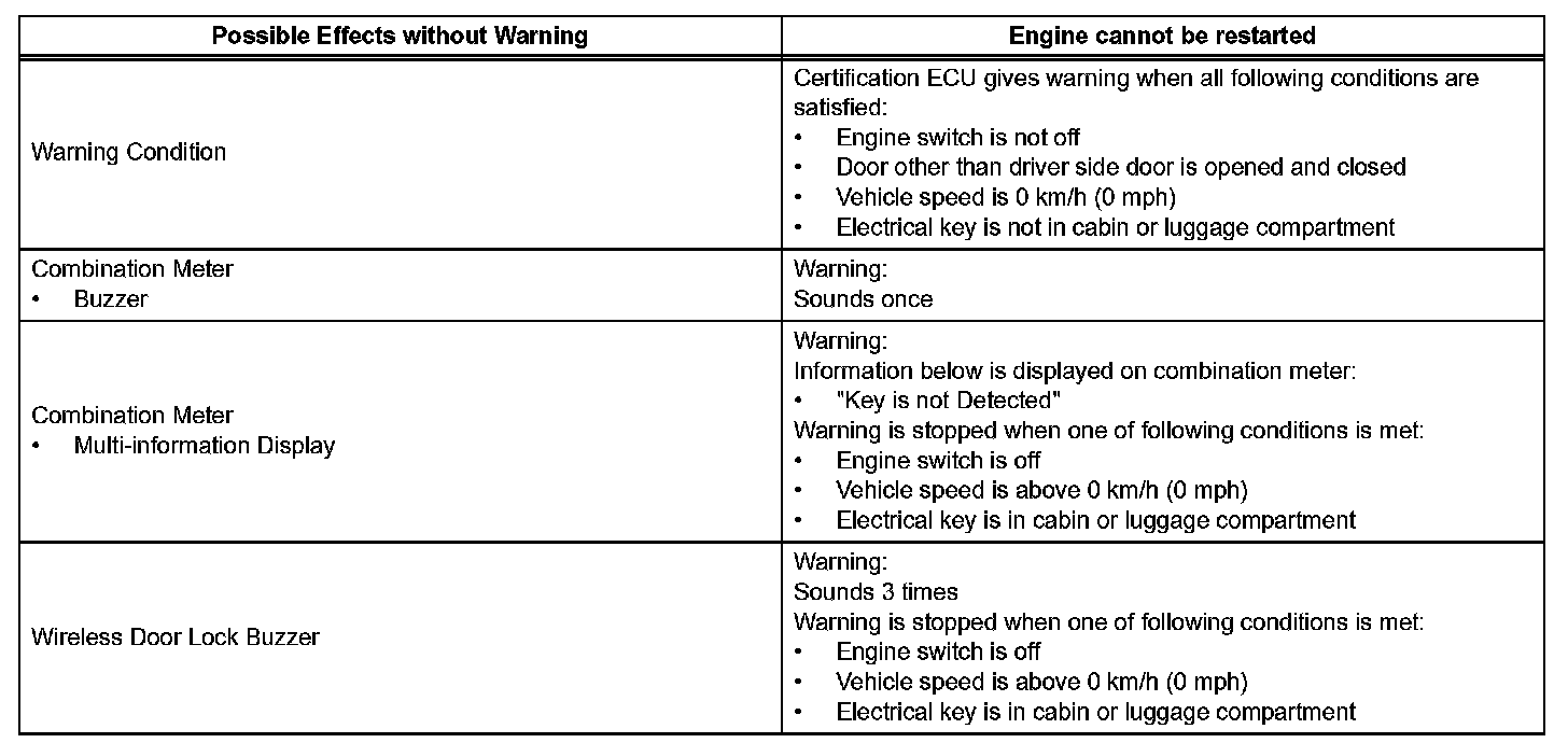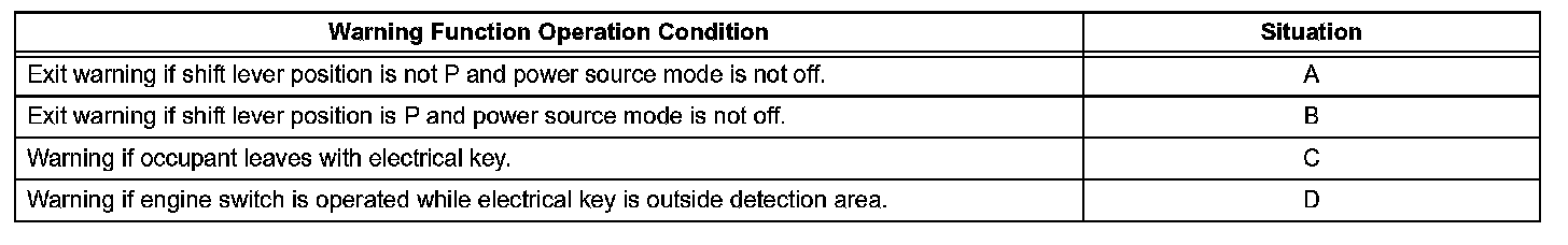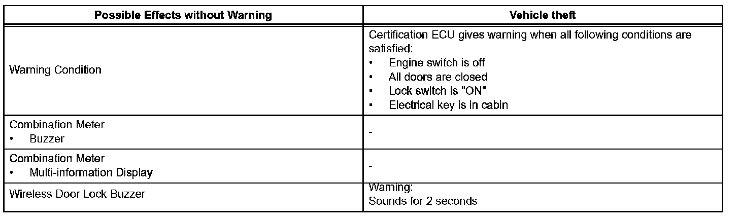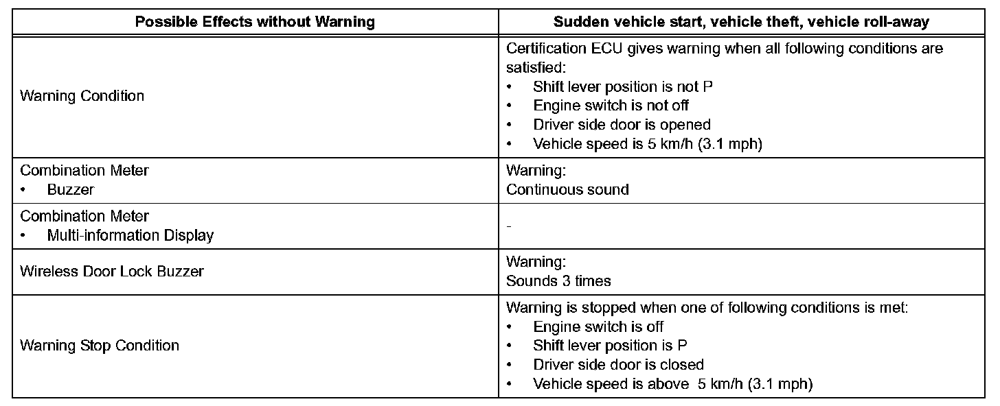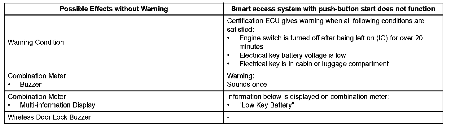 When any of the situations occur, the smart access system with push-button start causes the certification ECU to sound the buzzer in the combination meter and the wireless door lock buzzer, and illuminate the combination meter's multi-information display in order to alert the driver.