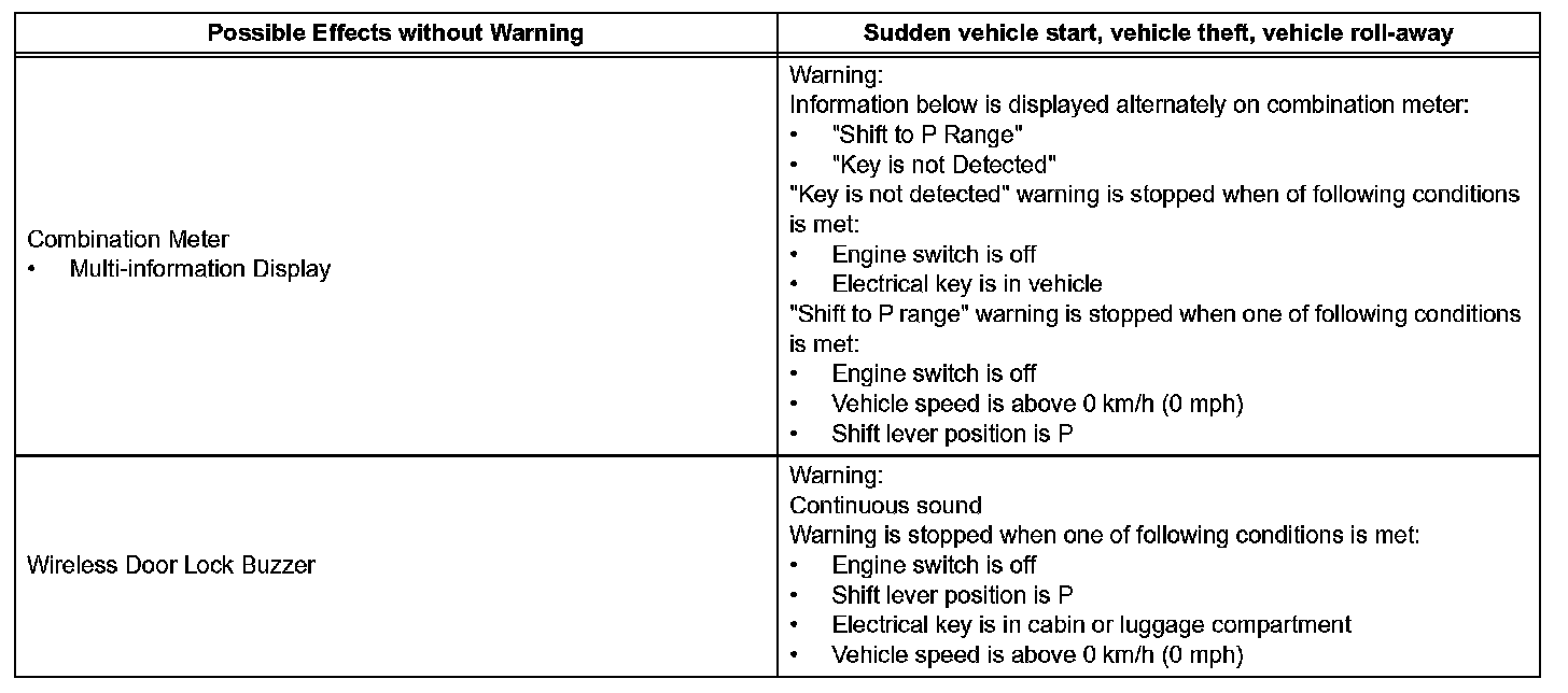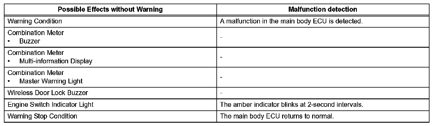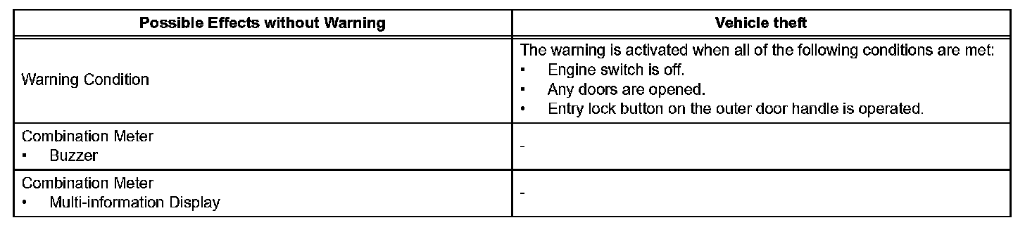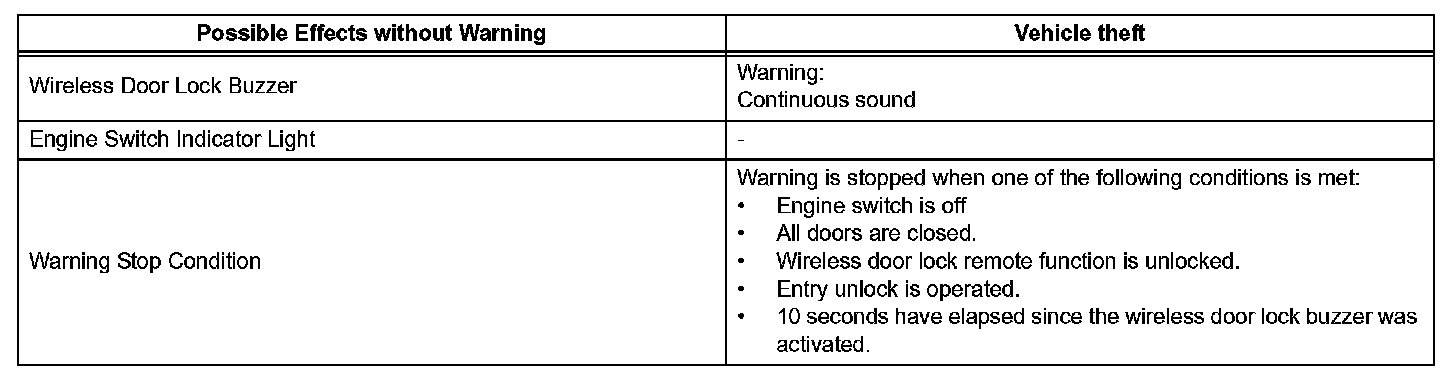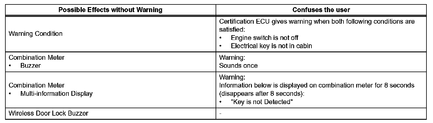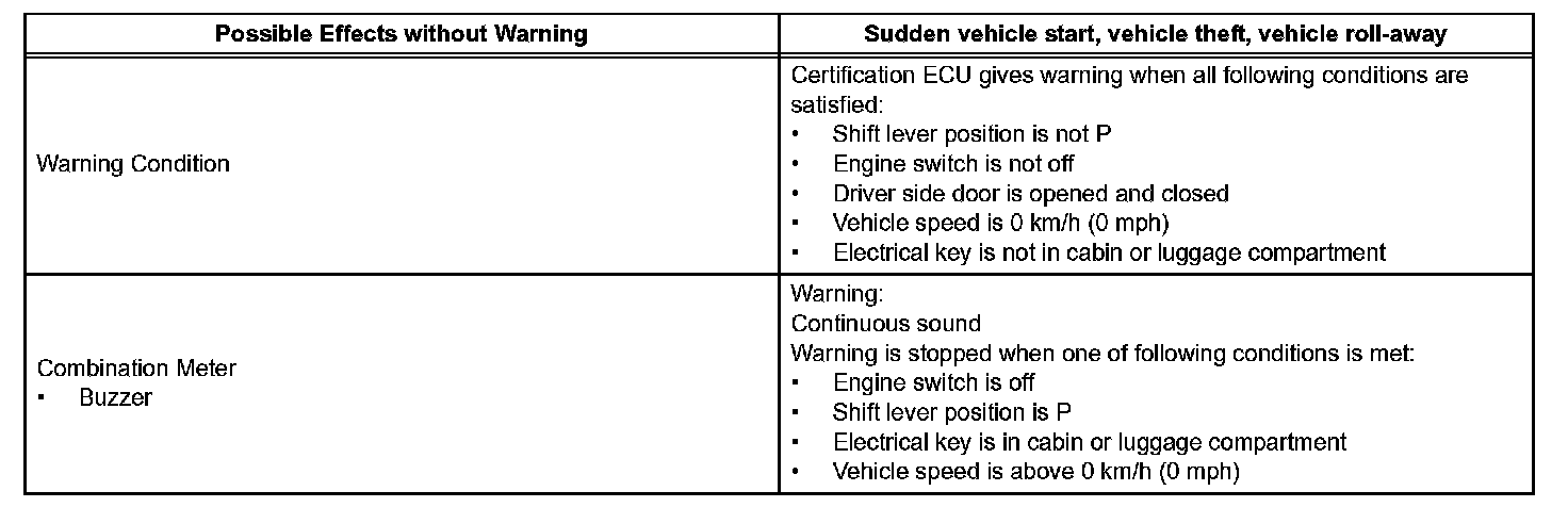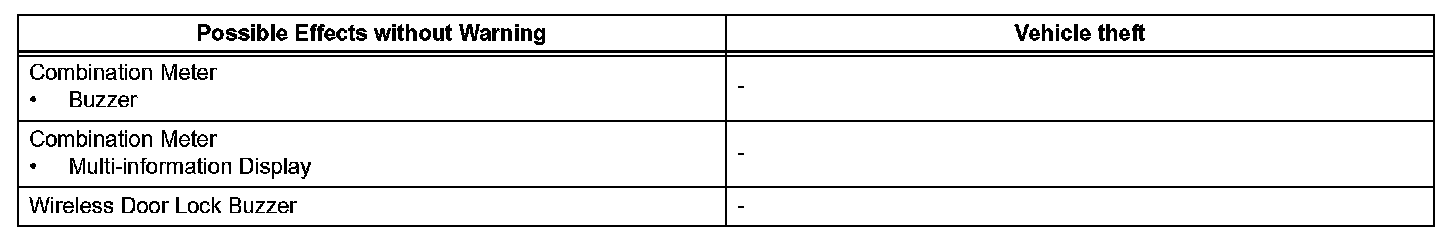 When any of the situations occur, the smart access system with push-button start causes the certification ECU to sound the buzzer in the combination meter and the wireless door lock buzzer, and illuminate the combination meter's multi-information display in order to alert the driver.