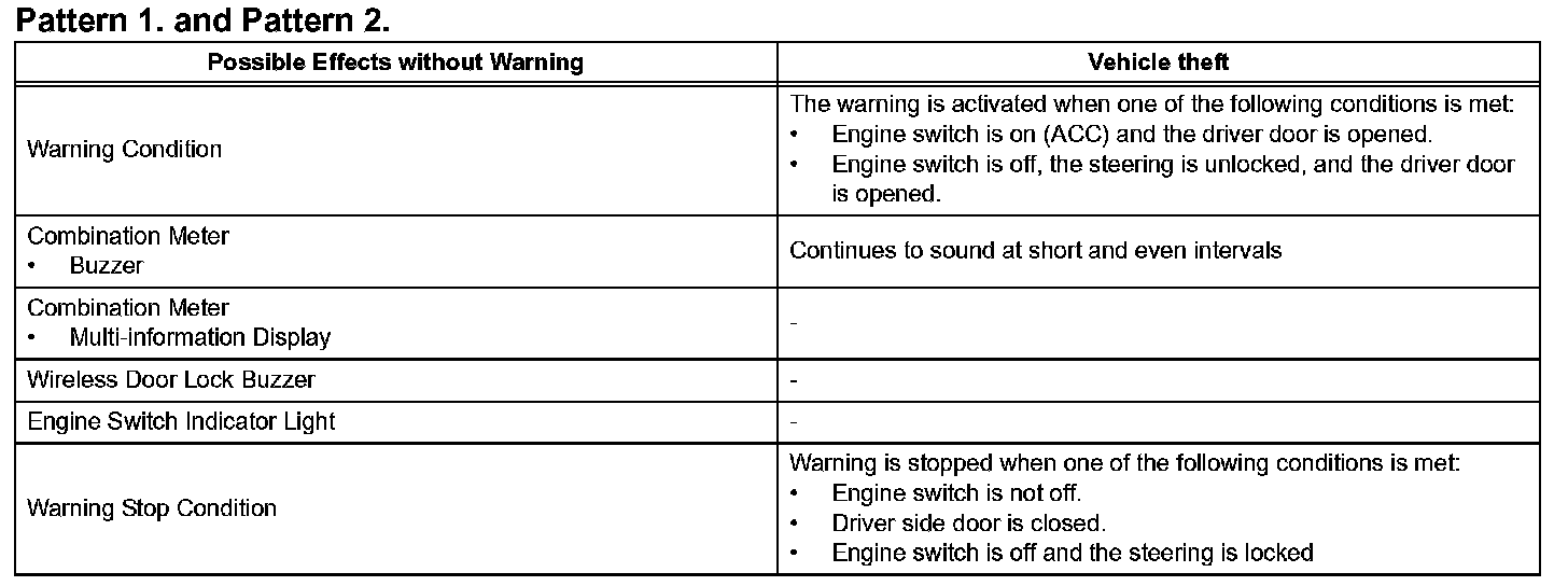 - Pattern 1: When the driver's door is open, the driver changes the power source mode to ACC and attempts to leave the vehicle.