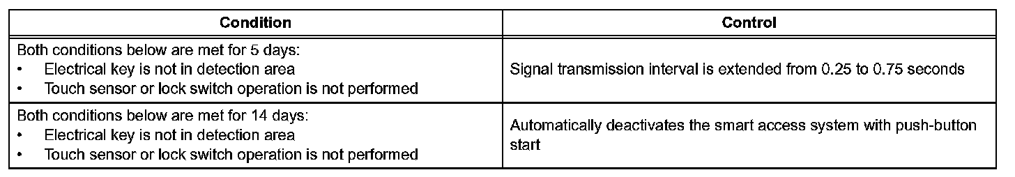 In the smart access system with push-button start, signals are emitted outside of the vehicle at a prescribed interval (0.25 seconds) when the doors are locked. Therefore, the vehicle battery could be drained if the vehicle remains parked for a long time. For this reason, the controls listed are carried out: