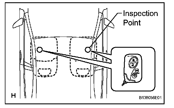 3. Inspect the entry ignition operation's detection area. Pay attention to the direction of the electrical key in the illustration. When the electrical key is in either of the 2 inspection points in the illustration, check that the engine can start.