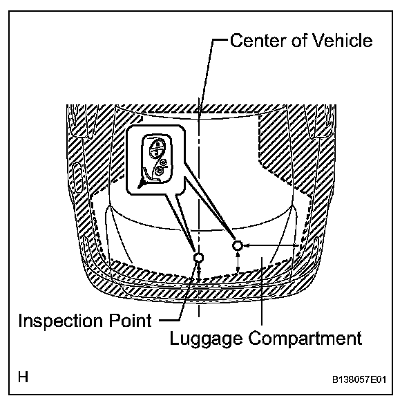2. Inspect the electrical key lock-in prevention's detection area. Pay attention to the direction of the electrical key given in the illustration. When the electrical key is in either of the 2 inspection points in the illustration, check that: 1) closing the luggage compartment door sounds the electrical key's wireless buzzer, and 2) pressing the power luggage door open switch opens the luggage compartment door.