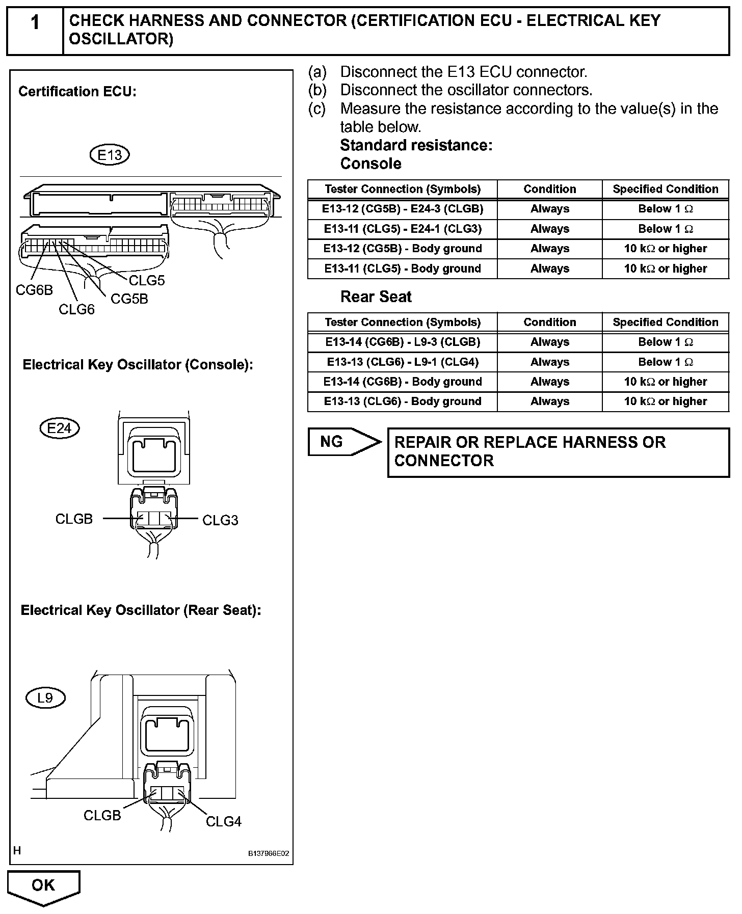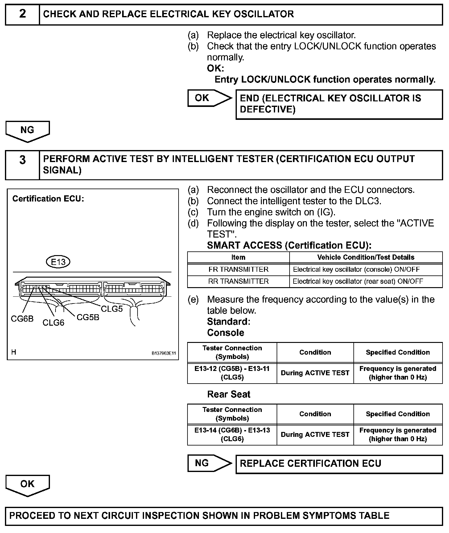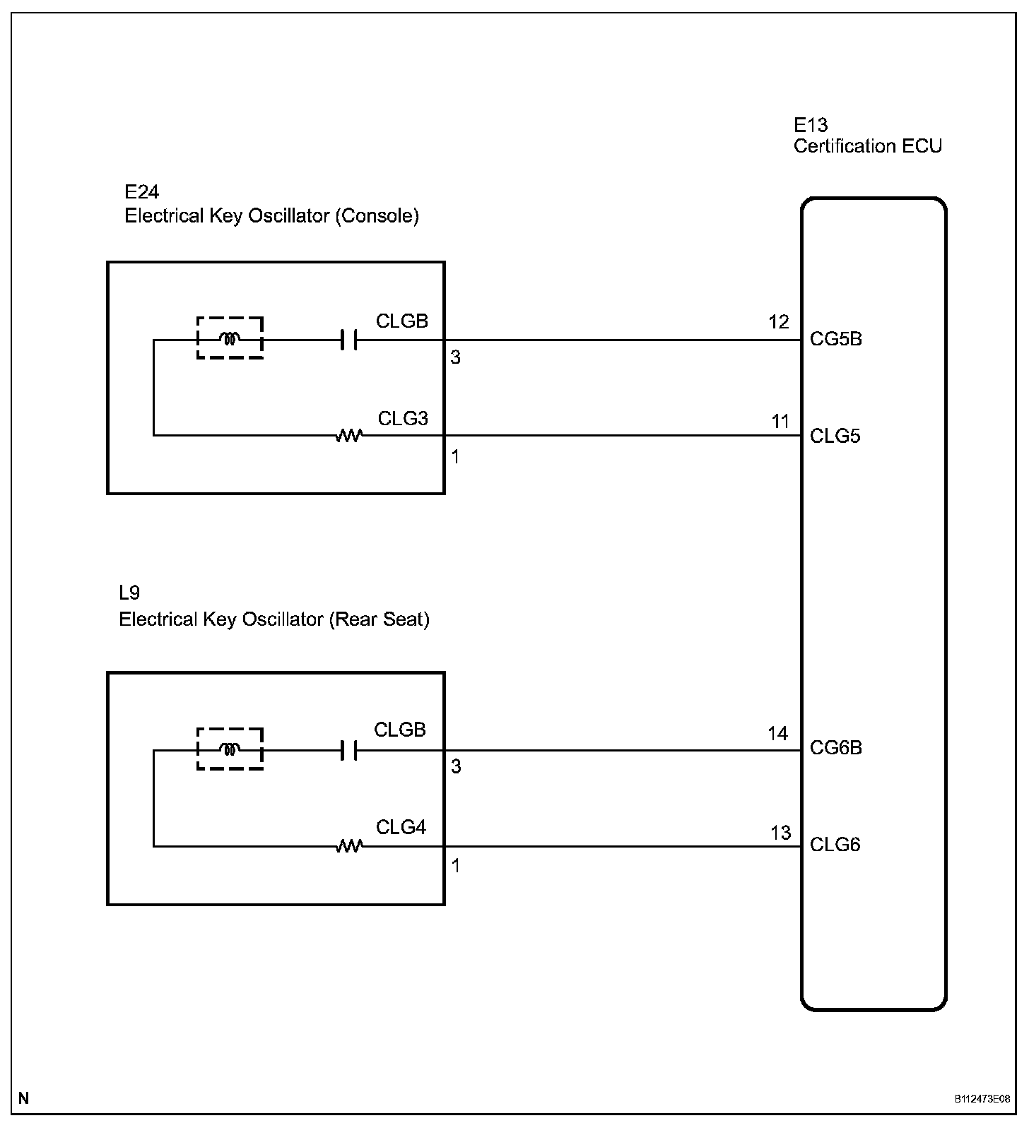 The certification ECU activates the electrical key oscillators (console and rear seat). The power is supplied from the certification ECU to both the electrical key oscillators (console and rear seat). The electrical key oscillators (console and rear seat) circuits have the same wiring. If the smart access system with push-button start does not operate properly inside the vehicle, check both the electrical key oscillators (console and rear seat) circuits.