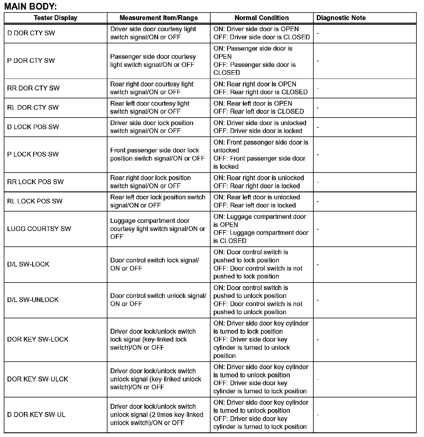 READ DATA LISTHINT: Using the intelligent tester's DATA LIST allows switch, sensor, actuator, and other item values to be read without removing any parts. Reading the DATA LIST early in troubleshooting is one way to save time.