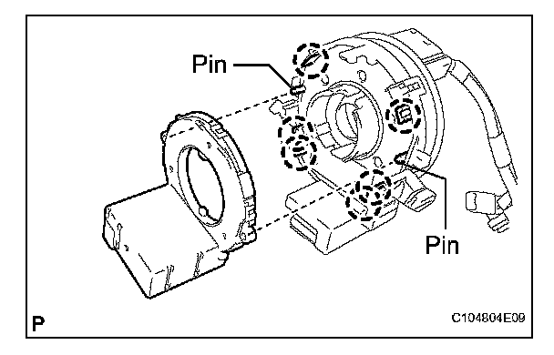 a. Align the locating pins, engage the claws, and install the steering angle sensor to the spiral cable.