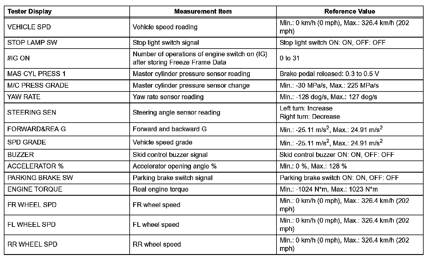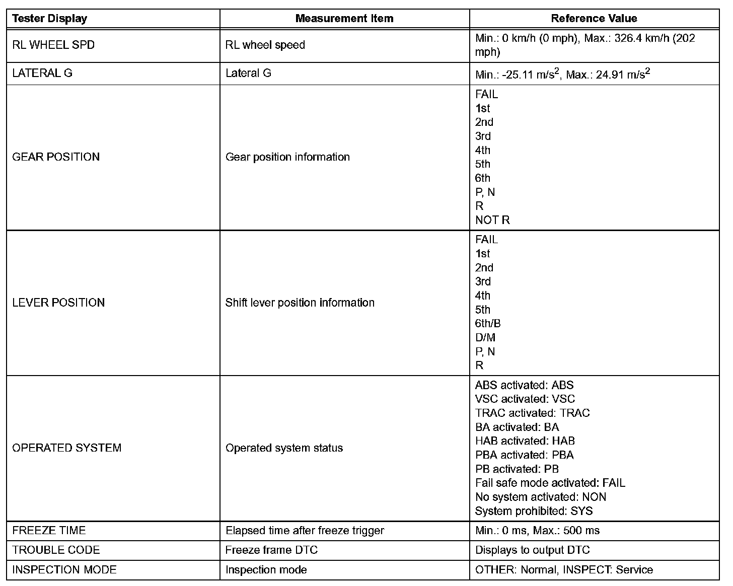 - Freeze Frame Data at the time a DTC is detected: When the skid control ECU stores data at the time a DTC is detected, no updates will be performed until the data is cleared.